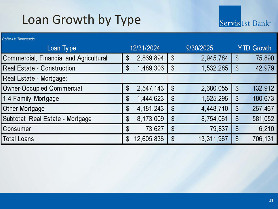 Balance Sheet Makeup ▪ Primary focus on building Adjusted deposits, highlighted by non - interest bearing accounts and non - reliance on CDs ▪ C&I lending expertise within a well balanced loan portfolio 20 Deposit Mix (1) 3.41% Cost of Interest Bearing Deposits (2 ) Loan Portfolio (1) 6.34% Yield on Loans (2) 1) For period ending September 30, 2025 2) Average for the three months ended September 30, 2025 Non - interest bearing 18% CDs 10% NOW, Money market, and savings 72% Commercial & industrial 22% Real estate - construction 12% CRE owner occupied 20% Consumer mortgage 12% CRE non - owner occupied 33% Consumer 1%