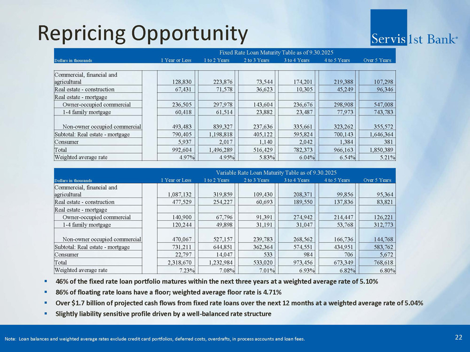 Loan Growth by Type 21 12/31/2024 9/30/2025 2,869,894$ 2,945,784$ 75,890$ 1,489,306$ 1,532,285$ 42,979$ 2,547,143$ 2,680,055$ 132,912$ 1,444,623$ 1,625,296$ 180,673$ 4,181,243$ 4,448,710$ 267,467$ 8,173,009$ 8,754,061$ 581,052$ 73,627$ 79,837$ 6,210$ 12,605,836$ 13,311,967$ 706,131$ Total Loans Dollars in Thousands YTD GrowthLoan Type Commercial, Financial and Agricultural Real Estate - Construction Real Estate - Mortgage: Owner-Occupied Commercial 1-4 Family Mortgage Other Mortgage Subtotal: Real Estate - Mortgage Consumer