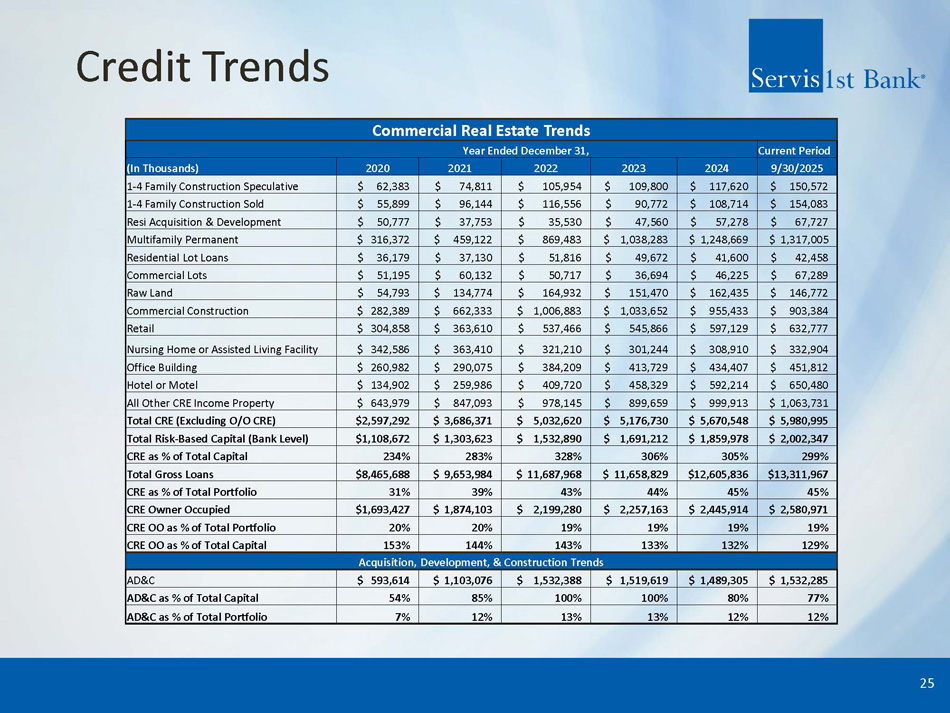 Credit Trends 25 Commercial Real Estate Trends Current Period Year Ended December 31, 9/30/2025 2024 2023 2022 2021 2020 (In Thousands) $ 150,572 $ 117,620 $ 109,800 $ 105,954 $ 74,811 $ 62,383 1 - 4 Family Construction Speculative $ 154,083 $ 108,714 $ 90,772 $ 116,556 $ 96,144 $ 55,899 1 - 4 Family Construction Sold $ 67,727 $ 57,278 $ 47,560 $ 35,530 $ 37,753 $ 50,777 Resi Acquisition & Development $ 1,317,005 $ 1,248,669 $ 1,038,283 $ 869,483 $ 459,122 $ 316,372 Multifamily Permanent $ 42,458 $ 41,600 $ 49,672 $ 51,816 $ 37,130 $ 36,179 Residential Lot Loans $ 67,289 $ 46,225 $ 36,694 $ 50,717 $ 60,132 $ 51,195 Commercial Lots $ 146,772 $ 162,435 $ 151,470 $ 164,932 $ 134,774 $ 54,793 Raw Land $ 903,384 $ 955,433 $ 1,033,652 $ 1,006,883 $ 662,333 $ 282,389 Commercial Construction $ 632,777 $ 597,129 $ 545,866 $ 537,466 $ 363,610 $ 304,858 Retail $ 332,904 $ 308,910 $ 301,244 $ 321,210 $ 363,410 $ 342,586 Nursing Home or Assisted Living Facility $ 451,812 $ 434,407 $ 413,729 $ 384,209 $ 290,075 $ 260,982 Office Building $ 650,480 $ 592,214 $ 458,329 $ 409,720 $ 259,986 $ 134,902 Hotel or Motel $ 1,063,731 $ 999,913 $ 899,659 $ 978,145 $ 847,093 $ 643,979 All Other CRE Income Property $ 5,980,995 $ 5,670,548 $ 5,176,730 $ 5,032,620 $ 3,686,371 $2,597,292 Total CRE (Excluding O/O CRE) $ 2,002,347 $ 1,859,978 $ 1,691,212 $ 1,532,890 $ 1,303,623 $1,108,672 Total Risk - Based Capital (Bank Level) 299% 305% 306% 328% 283% 234% CRE as % of Total Capital $13,311,967 $12,605,836 $ 11,658,829 $ 11,687,968 $ 9,653,984 $8,465,688 Total Gross Loans 45% 45% 44% 43% 39% 31% CRE as % of Total Portfolio $ 2,580,971 $ 2,445,914 $ 2,257,163 $ 2,199,280 $ 1,874,103 $1,693,427 CRE Owner Occupied 19% 19% 19% 19% 20% 20% CRE OO as % of Total Portfolio 129% 132% 133% 143% 144% 153% CRE OO as % of Total Capital Acquisition, Development, & Construction Trends $ 1,532,285 $ 1,489,305 $ 1,519,619 $ 1,532,388 $ 1,103,076 $ 593,614 AD&C 77% 80% 100% 100% 85% 54% AD&C as % of Total Capital 12% 12% 13% 13% 12% 7% AD&C as % of Total Portfolio
