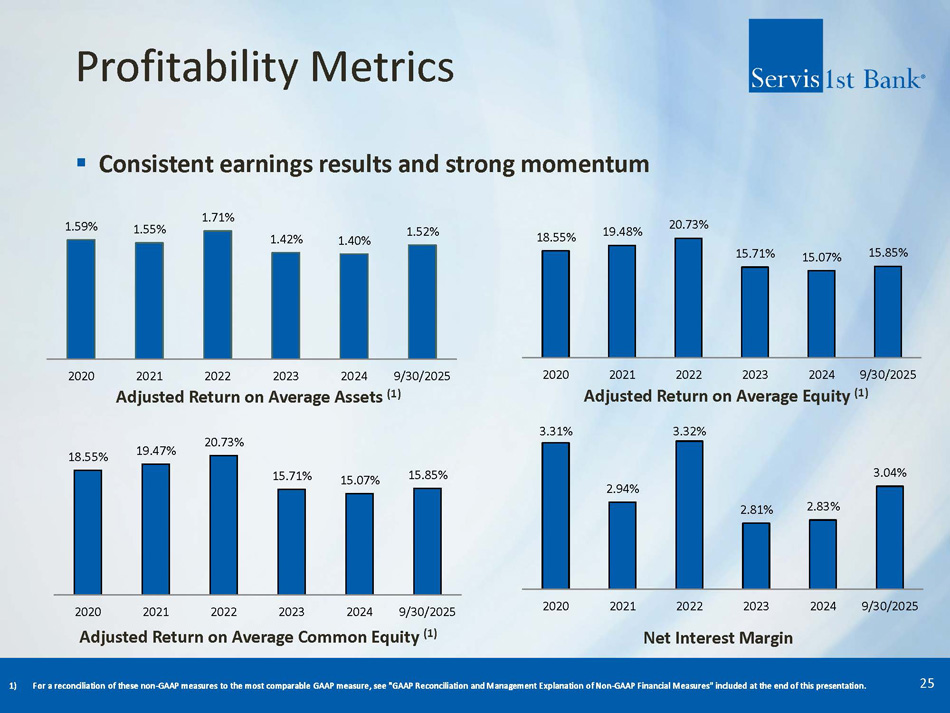 Credit Quality ▪ Strong loan growth while maintaining asset quality discipline 24 Allowance for Credit Losses / Total Loans Net Charge Offs / Total Average Loans Non - Performing Assets / Total Assets Non - Performing Loans / Total Loans 0.21% 0.09% 0.12% 0.14% 0.26% 0.96% 2020 2021 2022 2023 2024 9/30/2025 0.22% 0.13% 0.15% 0.18% 0.34% 1.26% 2020 2021 2022 2023 2024 9/30/2025 0.36% 0.03% 0.08% 0.10% 0.09% 0.22% 2020 2021 2022 2023 2024 9/30/2025 1.04% 1.22% 1.25% 1.32% 1.30% 1.28% 2020 2021 2022 2023 2024 9/30/2025