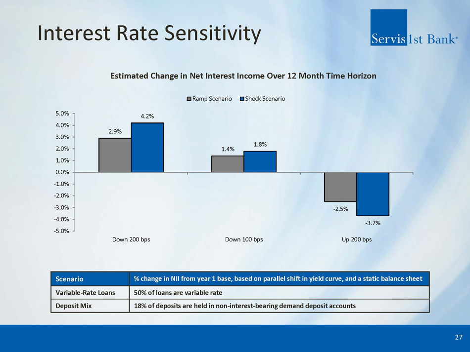 41.54% 38.69% 38.75% 40.60% 39.47% 34.71% 32.57% 33.28% 30.29% 31.84% 31.30% 38.28% 37.34% 33.38% 1.64% 1.51% 1.47% 1.55% 1.41% 1.32% 1.26% 1.20% 1.05% 0.98% 1.07% 1.11% 1.11% 1.05% 0.00% 1.00% 2.00% 3.00% 4.00% 5.00% 0.00% 10.00% 20.00% 30.00% 40.00% 50.00% 60.00% 70.00% Core Efficiency Ratio Core Non-interest Expense / Average Assets Efficiency ▪ Our operating structure and business strategy enable efficient, profitable growth 26 Adjusted Efficiency Ratio (1) and Adj. Non - interest Expense / Average Assets (1) (1) (1) 1) For a reconciliation of these non - GAAP measures to the most comparable GAAP measure, see "GAAP Reconciliation and Management Explanation of Non - GAAP Financial Measures" included at the end of this presentation .