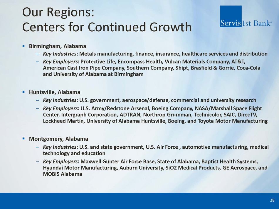 ServisFirst at a Glance Organic Growth Story ▪ Single bank BHC founded in Birmingham, Alabama ▪ Organic asset growth since the bank was founded in 2005 (1) : 24% CAGR High - Performing Metropolitan Commercial Bank ▪ Total Assets (2) : $17.6 billion ▪ Stockholders’ Equity (2) : $1.8 billion Strong Balance Sheet and Income Growth ▪ Gross Loans CAGR (4) : 14% ▪ Total Deposits CAGR (4) : 15% ▪ Net Income for Common CAGR (4) : 16% ▪ Diluted EPS CAGR (4) : 15% ▪ ROAA (3) : 1.44% ▪ Efficiency Ratio (3) : 34.56% 1) 19 - year compounded annual growth rate (CAGR) calculated from 12/31/05 – 12/31/2024; excludes the impact of ServisFirst’s one acquisition in 2015 – approximately $200 million 2) As of September 30, 2025 3) For nine months ended September 30, 2025 4) 10 - year compounded annual growth rate (CAGR) calculated from 12/31/14 – 12/31/24 3
