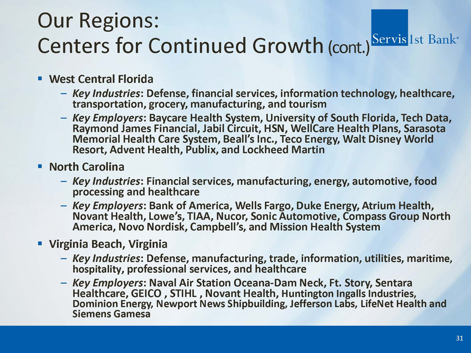 Our Regions: Centers for Continued Growth (cont.) ▪ Tennessee – Key Industries : Healthcare, manufacturing, entertainment, transportation, education and technology – Key Employers : HCA Holdings, Nissan North America, Dollar General Corporation, Asurion, Community Health Systems, FedEx, AutoZone, Vanderbilt University, BlueCross BlueShield and International Paper ▪ Charleston, South Carolina – Key Industries : Maritime, information technology, higher education, military, manufacturing, and tourism – Key Employers : Joint Base Charleston, Medical University of South Carolina, Roper St. Francis Healthcare, Boeing Company, Robert Bosch LLC, Blackbaud, Trident Health, Mercedes - Benz Vans and SAIC ▪ Atlanta, Georgia – Key Industries : Logistics, media, information technology, education and entertainment – Key Employers : Coca - Cola Company, Home Depot, Delta Air Lines, AT&T Mobility, UPS, Newell - Rubbermaid, Cable News Network, Georgia Tech, Lockheed Martin and Cox Enterprises 30
