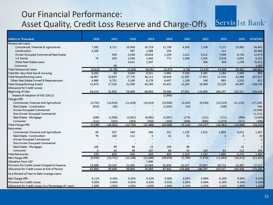Our Financial Performance: Key Operating and Performance Metrics 32 1) For a reconciliation of these non - GAAP measures to the most comparable GAAP measure, see "GAAP Reconciliation and Management Exp lanation of Non - GAAP Financial Measures" included at the end of this presentation. 2) Non - GAAP financial measures. "Tangible Common Equity to Tangible Assets" and "Tangible Book value per Share" are not measures o f financial performance recognized by generally accepted accounting principles in the United States, or GAAP. Dollars in Millions Except per Share Amounts 9/30/2025 2024 2023 2022 2021 2020 2019 2018 2017 2016 Balance Sheet $ 17,584 $17,352 $16,130 $14,596 $15,449 $11,933 8948 $8,007 $7,082 $6,370 Total Assets $1 3,142 $12,441 $11,506 $11,542 $9,416 $8,378 7185 $6,465 $5,792 $4,860 Net Loans $1 4,107 $13,543 $13,274 $11,547 $12,453 $9,976 7530 $6,916 $6,092 $5,420 Deposits 93 % 92% 87% 100% 76% 84% 95% 93% 95% 90% Net Loans / Deposits $ 1,782 $1,617 $1,440 $1,298 $1,152 $993 $843 $715 $608 $523 Total Equity Profitability $ 190.2 $227.2 $206.9 $251.5 $207.7 $169.6 $149.2 $136.9 $93.1 $81.5 Net Income $ 190.2 $227.2 $206.8 $251.4 $207.7 $169.5 $149.2 $136.9 $93.0 $81.4 Net Income Available to Common $ 200.7 $22 8 . 5 $206.8 $251.4 $210.0 $169.5 $147.9 $136.9 $96.3 $81.4 Adj. Net Income Available to Common (1) 1. 52 % 1. 40 % 1.37% 1.71% 1.55% 1.59% 1.71% 1.88% 1.48% 1.42% Adj. ROAA (1) 15.85 % 1 5.07 % 15.13% 20.73% 19.48% 18.55% 19.00% 20.96% 16.96% 16.64% Adj. ROAE (1) 1 5.85 % 1 5.07 % 15.13% 20.73% 19.47% 18.55% 18.99% 20.95% 16.95% 16.63% Adj. ROACE (1) 3.04 % 2.82% 2.81% 3.32% 2.94% 3.31% 3.46% 3.75% 3.68% 3.42% Net Interest Margin 3 3.38 % 37. 34 % 40.67% 31.30% 31.84% 30.29% 33.31% 32.57% 34.71% 39.47% Adj. Efficiency Ratio (1) Capital Adequacy 10.06 % 9.25% 8.85% 8.81% 7.38% 8.22% 9.27% 8.77% 8.39% 7.99% Tangible Common Equity to Tangible Assets (2) 11. 49 % 11. 42 % 10 . 9 1 % 9.55% 9.95% 10.50% 10.50% 10.12% 9.51% 9.78% Common Equity Tier 1 RBC Ratio 10.01 % 9.5 9 % 9.12% 9.29% 7.39% 8.23% 9.13% 9.07% 8.51% 8.22% Tier I Leverage Ratio 11. 50 % 11. 42 % 10.92% 9.55% 9.96% 10.50% 10.50% 10.13% 9.52% 9.78% Tier I RBC Ratio 12. 91 % 12. 90 % 12.45% 11.03% 11.58% 12.20% 12.31% 12.05% 11.52% 11.84% Total RBC Ratio Asset Quality 0. 96 % 0. 2 6% 0.1 4 % 0.12% 0.09% 0.21% 0.50% 0.41% 0.25% 0.34% NPAs / Assets 0. 22 % 0.0 9 % 0. 10 % 0.08% 0.03% 0.36% 0.32% 0.20% 0. 29 % 0.11% NCOs / Average Loans 1. 28 % 1.30% 1.32% 1.25% 1.22% 1.04% 1.05% 1.05% 1.02% 1.06% Credit Loss Reserve / Gross Loans Per Share Information 54, 621,441 54,5 70 , 138 54,461,580 54,326,527 54,227,060 53,943,751 53,623,740 53,375,195 52,992,586 52,636,896 Common Shares Outstanding $ 32.62 $29.63 $26.45 $23.89 $21.24 $18.41 $15.71 $13.40 $11.47 $9.93 Book Value per Share $ 32.37 $29.38 $26.20 $23.64 $20.99 $18.15 $15.45 $13.13 $11.19 $9.65 Tangible Book Value per Share (2) $ 3.48 $4.16 $3.79 $4.61 $3.82 $3.13 $2.76 $2.53 $1.72 $1.52 Diluted Earnings per Share $ 3.67 $4.1 8 $3.79 $4.61 $3.86 $3.13 $2.74 $2.53 $1.78 $1.52 Adj. Diluted Earnings per Share (1)