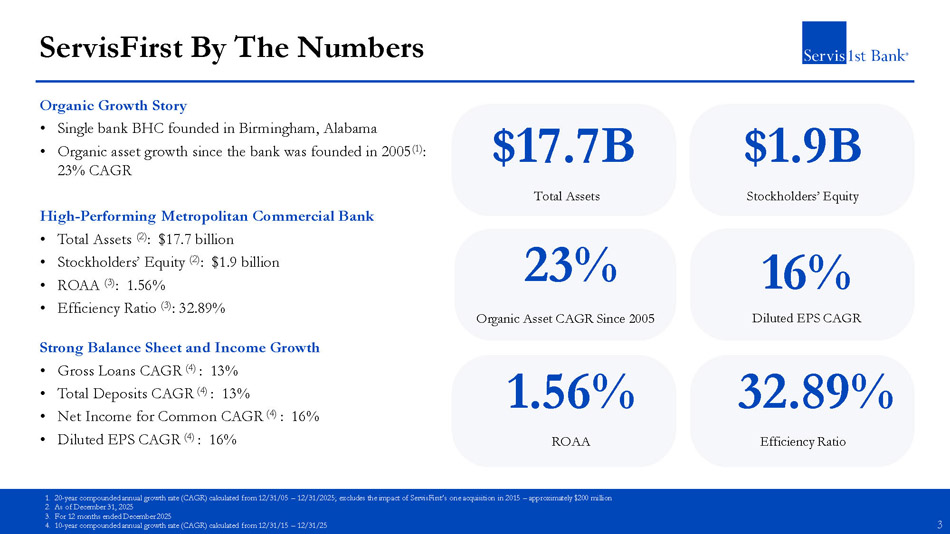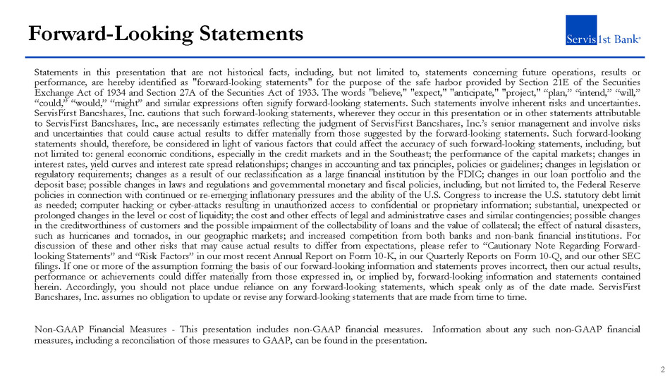 Forward - Looking Statements Statements in this presentation that are not historical facts, including, but not limited to, statements concerning future operations, results or performance, are hereby identified as "forward - looking statements" for the purpose of the safe harbor provided by Section 21 E of the Securities Exchange Act of 1934 and Section 27 A of the Securities Act of 1933 . The words "believe," "expect," "anticipate," "project," “plan,” “intend,” “will,” “could,” “would,” “might” and similar expressions often signify forward - looking statements . Such statements involve inherent risks and uncertainties . ServisFirst Bancshares, Inc . cautions that such forward - looking statements, wherever they occur in this presentation or in other statements attributable to ServisFirst Bancshares, Inc . , are necessarily estimates reflecting the judgment of ServisFirst Bancshares, Inc . ’s senior management and involve risks and uncertainties that could cause actual results to differ materially from those suggested by the forward - looking statements . Such forward - looking statements should, therefore, be considered in light of various factors that could affect the accuracy of such forward - looking statements, including, but not limited to : general economic conditions, especially in the credit markets and in the Southeast ; the performance of the capital markets ; changes in interest rates, yield curves and interest rate spread relationships ; changes in accounting and tax principles, policies or guidelines ; changes in legislation or regulatory requirements ; changes as a result of our reclassification as a large financial institution by the FDIC ; changes in our loan portfolio and the deposit base ; possible changes in laws and regulations and governmental monetary and fiscal policies, including, but not limited to, the Federal Reserve policies in connection with continued or re - emerging inflationary pressures and the ability of the U . S . Congress to increase the U . S . statutory debt limit as needed ; computer hacking or cyber - attacks resulting in unauthorized access to confidential or proprietary information ; substantial, unexpected or prolonged changes in the level or cost of liquidity ; the cost and other effects of legal and administrative cases and similar contingencies ; possible changes in the creditworthiness of customers and the possible impairment of the collectability of loans and the value of collateral ; the effect of natural disasters, such as hurricanes and tornados, in our geographic markets ; and increased competition from both banks and non - bank financial institutions . For discussion of these and other risks that may cause actual results to differ from expectations, please refer to “Cautionary Note Regarding Forward - looking Statements” and “Risk Factors” in our most recent Annual Report on Form 10 - K, in our Quarterly Reports on Form 10 - Q, and our other SEC filings . If one or more of the assumption forming the basis of our forward - looking information and statements proves incorrect, then our actual results, performance or achievements could differ materially from those expressed in, or implied by, forward - looking information and statements contained herein . Accordingly, you should not place undue reliance on any forward - looking statements, which speak only as of the date made . ServisFirst Bancshares, Inc . assumes no obligation to update or revise any forward - looking statements that are made from time to time . Non - GAAP Financial Measures - This presentation includes non - GAAP financial measures . Information about any such non - GAAP financial measures, including a reconciliation of those measures to GAAP, can be found in the presentation . 2
