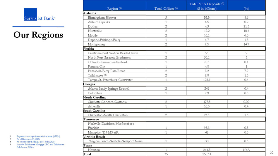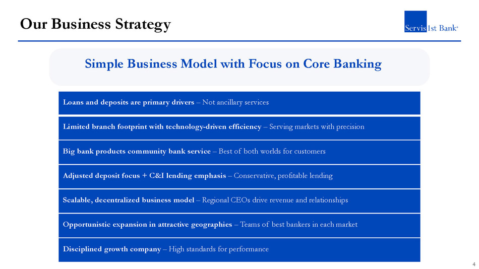 $17.7B Total Assets ServisFirst By The Numbers Organic Growth Story • Single bank BHC founded in Birmingham, Alabama • Organic asset growth since the bank was founded in 2005 (1) : 23% CAGR High - Performing Metropolitan Commercial Bank • Total Assets (2) : $17.7 billion • Stockholders’ Equity (2) : $1.9 billion • ROAA (3) : 1.56% • Efficiency Ratio (3) : 32.89% Strong Balance Sheet and Income Growth • Gross Loans CAGR (4) : 13% • Total Deposits CAGR (4) : 13% • Net Income for Common CAGR (4) : 16% • Diluted EPS CAGR (4) : 16% $1.9B Stockholders’ Equity 16% Diluted EPS CAGR 23% Organic Asset CAGR Since 2005 32.89% Efficiency Ratio 1.56% ROAA 1. 20 - year compounded annual growth rate (CAGR) calculated from 12/31/05 – 12/31/2025; excludes the impact of ServisFirst’s one acquisition in 2015 – approximately $200 million 2. As of December 31, 2025 3. For 12 months ended December 2025 4. 10 - year compounded annual growth rate (CAGR) calculated from 12/31/15 – 12/31/25 3