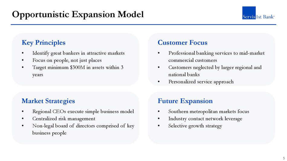 Simple Business Model with Focus on Core Banking Our Business Strategy Loans and deposits are primary drivers – Not ancillary services Limited branch footprint with technology - driven efficiency – Serving markets with precision Big bank products community bank service – Best of both worlds for customers Adjusted deposit focus + C&I lending emphasis – Conservative, profitable lending Scalable, decentralized business model – Regional CEOs drive revenue and relationships Opportunistic expansion in attractive geographies – Teams of best bankers in each market Disciplined growth company – High standards for performance 4