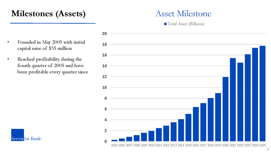 Key Principles • Identify great bankers in attractive markets • Focus on people, not just places • Target minimum $300M in assets within 3 years Market Strategies • Regional CEOs execute simple business model • Centralized risk management • Non - legal board of directors comprised of key business people Customer Focus • Professional banking services to mid - market commercial customers • Customers neglected by larger regional and national banks • Personalized service approach Future Expansion • Southern metropolitan markets focus • Industry contact network leverage • Selective growth strategy Opportunistic Expansion Model 5