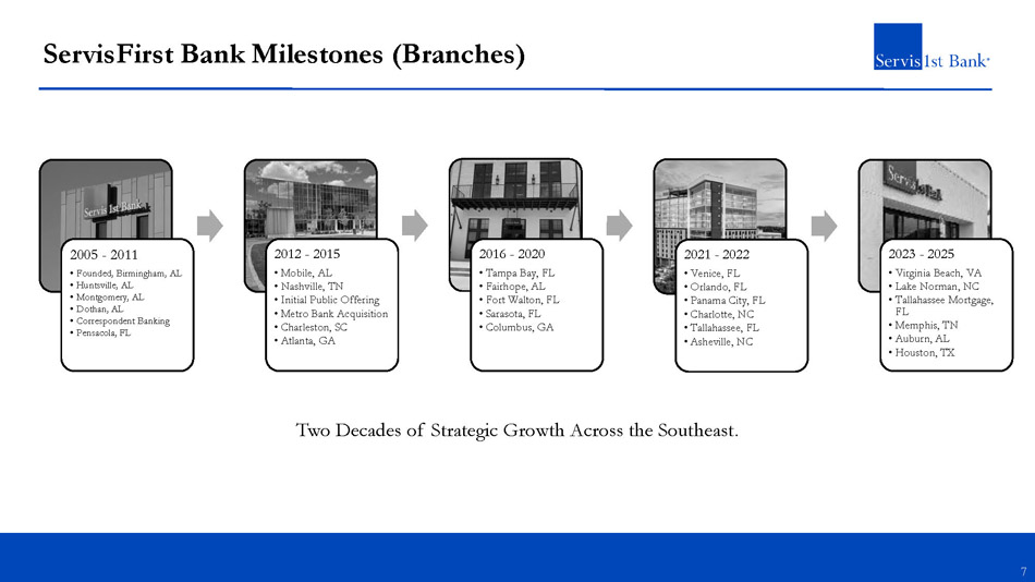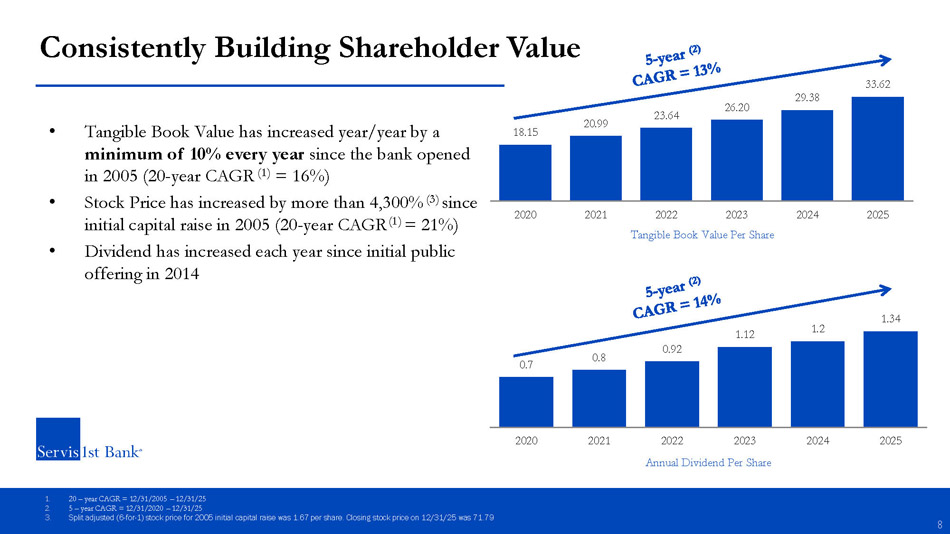 ServisFirst Bank Milestones (Branches) 2005 - 2011 • Founded, Birmingham, AL • Huntsville, AL • Montgomery , AL • Dothan, AL • Correspondent Banking • Pensacola, FL 2012 - 2015 • Mobile, AL • Nashville, TN • Initial Public Offering • Metro Bank Acquisition • Charleston, SC • Atlanta, GA 2016 - 2020 • Tampa Bay, FL • Fairhope, AL • Fort Walton, FL • Sarasota, FL • Columbus, GA 2021 - 2022 • Venice, FL • Orlando, FL • Panama City, FL • Charlotte, NC • Tallahassee, FL • Asheville, NC 2023 - 2025 • Virginia Beach, VA • Lake Norman, NC • Tallahassee Mortgage, FL • Memphis, TN • Auburn, AL • Houston, TX Two Decades of Strategic Growth Across the Southeast. 7