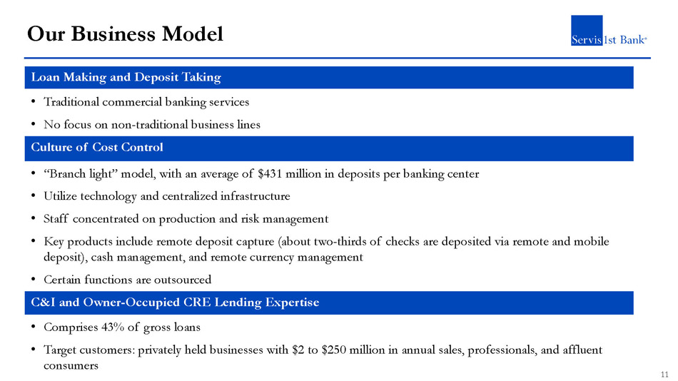 Our Regions 1. Represents metropolitan statistical areas (MSAs) ) 2. As of December 31, 2025 3. As reported by the FDIC as of 6/30/2025 4. Includes Tallahassee Mortgage LPO and Tallahassee Full - Service Office 10 Total Offices (2) Region (1) (%) Total MSA Deposits (3) ($ in billions) Alabama 8.6 52.9 3 Birmingham - Hoover 0.2 4.5 1 Auburn - Opelika 21.3 4.3 2 Dothan 10.4 12.2 2 Huntsville 6.5 10.1 2 Mobile 1.8 6.7 1 Daphne - Fairhope - Foley 14.7 9.5 2 Montgomery Florida 2 5.1 1 Crestview - Fort Walton Beach - Destin 3 30.1 2 North Port - Sarasota - Bradenton 0.1 70.1 1 Orlando - Kissimmee - Sanford 1 4.8 1 Panama City 7.9 8.2 2 Pensacola - Ferry Pass - Brent 1.3 8.8 2 Tallahassee (4) 0.4 128.1 1 Tampa - St. Petersburg - Clearwater Georgia 0.4 246 2 Atlanta - Sandy Springs - Roswell 0.3 9.9 1 Columbus North Carolina 0.02 477.3 2 Charlotte - Concord - Gastonia 0.4 10.6 1 Asheville South Carolina 1.6 23.1 2 Charleston - North Charleston Tennessee 0.8 98.3 1 Nashville - Davidson - Murfreesboro - Franklin 0.3 42 1 Memphis, TN - MS - AR Virginia Beach 0.3 30 1 Virginia Beach - Norfolk - Newport News Texas N/A 264.8 1 Houston 1557.4 35 Total
