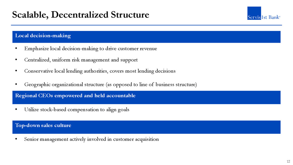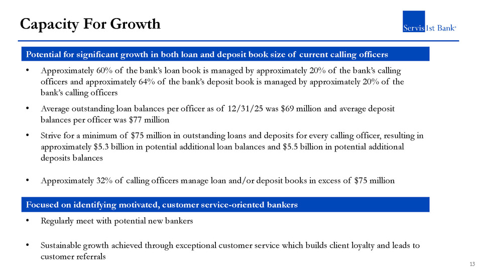 Scalable, Decentralized Structure Local decision - making • Emphasize local decision - making to drive customer revenue • Centralized, uniform risk management and support • Conservative local lending authorities, covers most lending decisions • Geographic organizational structure (as opposed to line of business structure) Regional CEOs empowered and held accountable • Utilize stock - based compensation to align goals Top - down sales culture • Senior management actively involved in customer acquisition 12