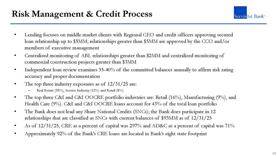 Capacity For Growth Potential for significant growth in both loan and deposit book size of current calling officers • Approximately 60% of the bank’s loan book is managed by approximately 20% of the bank’s calling officers and approximately 64% of the bank’s deposit book is managed by approximately 20% of the bank’s calling officers • Average outstanding loan balances per officer as of 12/31/25 was $69 million and average deposit balances per officer was $77 million • Strive for a minimum of $75 million in outstanding loans and deposits for every calling officer, resulting in approximately $5.3 billion in potential additional loan balances and $5.5 billion in potential additional deposits balances • Approximately 32% of calling officers manage loan and/or deposit books in excess of $75 million Focused on identifying motivated, customer service - oriented bankers • Regularly meet with potential new bankers • Sustainable growth achieved through exceptional customer service which builds client loyalty and leads to customer referrals 13