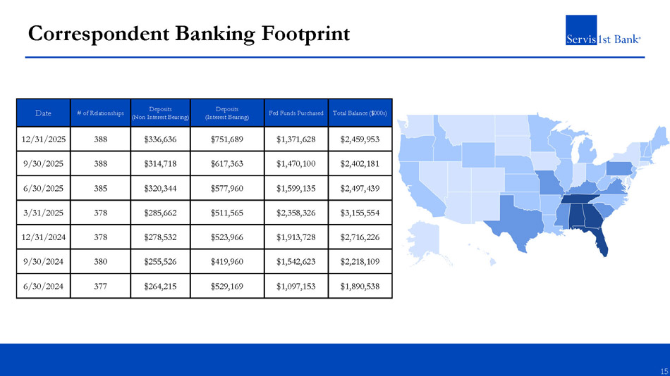Correspondent Banking Footprint Total Balance ($000s) Fed Funds Purchased Deposits (Interest Bearing) Deposits (Non Interest Bearing) # of Relationships Date $2,459,953 $1,371,628 $751,689 $336,636 388 12/31/2025 $2,402,181 $1,470,100 $617,363 $314,718 388 9/30/2025 $2,497,439 $1,599,135 $577,960 $320,344 385 6/30/2025 $3,155,554 $2,358,326 $511,565 $285,662 378 3/31/2025 $2,716,226 $1,913,728 $523,966 $278,532 378 12/31/2024 $2,218,109 $1,542,623 $419,960 $255,526 380 9/30/2024 $1,890,538 $1,097,153 $529,169 $264,215 377 6/30/2024 15 15