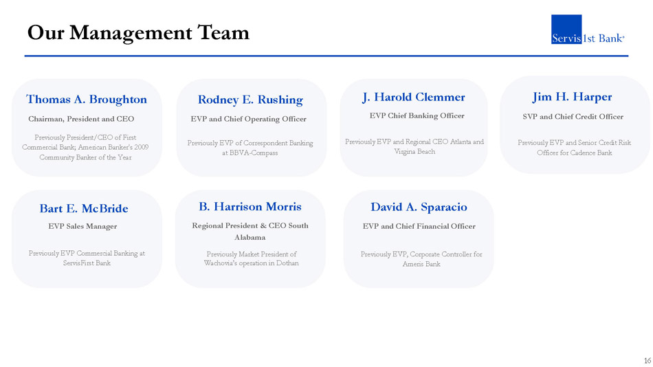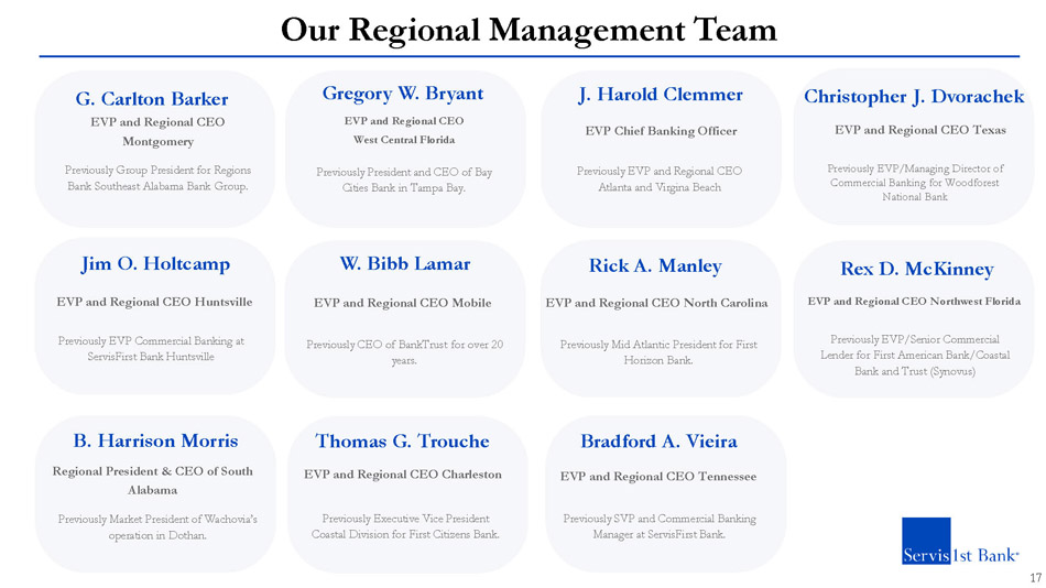 Thomas A. Broughton Chairman, President and CEO Previously President/CEO of First Commercial Bank; American Banker's 2009 Community Banker of the Year David A. Sparacio EVP and Chief Financial Officer Previously EVP, Corporate Controller for Ameris Bank Rodney E. Rushing EVP and Chief Operating Officer Previously EVP of Correspondent Banking at BBVA - Compass Jim H. Harper SVP and Chief Credit Officer Previously EVP and Senior Credit Risk Officer for Cadence Bank Our Management Team J. Harold Clemmer EVP Chief Banking Officer Previously EVP and Regional CEO Atlanta and Virgina Beach Bart E. McBride EVP Sales Manager Previously EVP Commercial Banking at ServisFirst Bank B. Harrison Morris Regional President & CEO South Alabama Previously Market President of Wachovia’s operation in Dothan 16