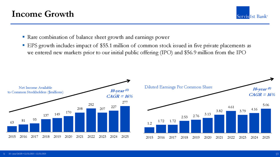 ▪ Rare combination of balance sheet growth and earnings power ▪ EPS growth includes impact of $55.1 million of common stock issued in five private placements as we entered new markets prior to our initial public offering (IPO) and $56.9 million from the IPO 1) 10 – year CAGR = 12/31/2015 – 12/31/2025 63 81 93 137 149 170 208 252 207 227 277 2015 2016 2017 2018 2019 2020 2021 2022 2023 2024 2025 Net Income Available to Common Stockholders ($millions) 1.2 1.72 1.72 2.53 2.76 3.13 3.82 4.61 3.79 4.16 5.06 2015 2016 2017 2018 2019 2020 2021 2022 2023 2024 2025 Diluted Earnings Per Common Share Income Growth 10 - year (1) CAGR = 16% 10 - year (1) CAGR = 16% 19