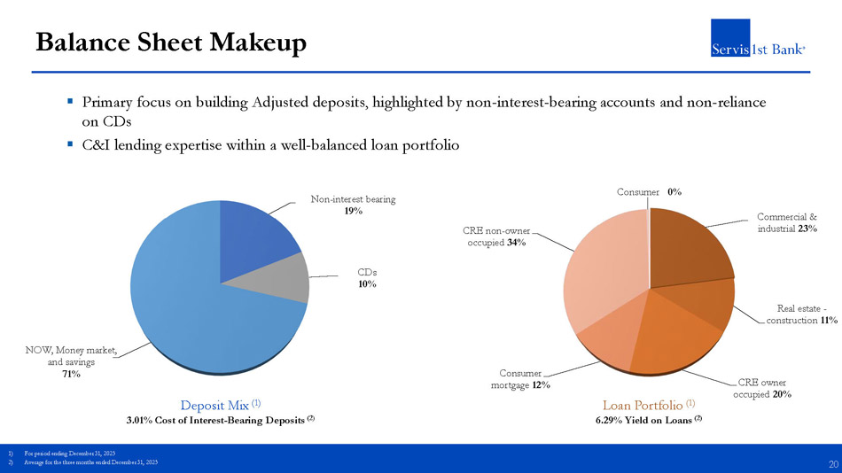 ▪ Primary focus on building Adjusted deposits, highlighted by non - interest - bearing accounts and non - reliance on CDs ▪ C&I lending expertise within a well - balanced loan portfolio Deposit Mix (1) 3.01% Cost of Interest - Bearing Deposits (2 ) Loan Portfolio (1) 6.29% Yield on Loans (2) 1) For period ending December 31, 2025 2) Average for the three months ended December 31, 2025 Non - interest bearing 19% CDs 10% NOW, Money market, and savings 71% Commercial & industrial 23% Real estate - construction 11% CRE owner occupied 20% Consumer mortgage 12% CRE non - owner occupied 34% Consumer 0% Balance Sheet Makeup 20