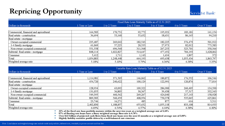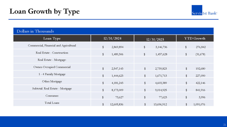 Loan Growth by Type Dollars in Thousands YTD Growth 12/31/2025 12/31/2024 Loan Type $ 276,842 $ 3,146,736 $ 2,869,894 Commercial, Financial and Agricultural $ (31,678) $ 1,457,628 $ 1,489,306 Real Estate - Construction Real Estate - Mortgage: $ 192,680 $ 2,739,823 $ 2,547,143 Owner - Occupied Commercial $ 227,090 $ 1,671,713 $ 1,444,623 1 - 4 Family Mortgage $ 422,146 $ 4,603,389 $ 4,181,243 Other Mortgage $ 841,916 $ 9,014,925 $ 8,173,009 Subtotal: Real Estate - Mortgage $ 3,996 $ 77,623 $ 73,627 Consumer $ 1,091,076 $ 13,696,912 $ 12,605,836 Total Loans 21
