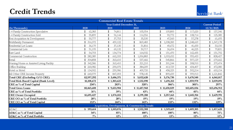 Commercial Real Estate Trends Current Period Year Ended December 31, 12/31/2025 2024 2023 2022 2021 2020 (In Thousands) $ 157,346 $ 117,620 $ 109,800 $ 105,954 $ 74,811 $ 62,383 1 - 4 Family Construction Speculative $ 125,385 $ 108,714 $ 90,772 $ 116,556 $ 96,144 $ 55,899 1 - 4 Family Construction Sold $ 61,695 $ 57,278 $ 47,560 $ 35,530 $ 37,753 $ 50,777 Resi Acquisition & Development $ 1,347,178 $ 1,248,669 $ 1,038,283 $ 869,483 $ 459,122 $ 316,372 Multifamily Permanent $ 53,150 $ 41,600 $ 49,672 $ 51,816 $ 37,130 $ 36,179 Residential Lot Loans $ 79,831 $ 46,225 $ 36,694 $ 50,717 $ 60,132 $ 51,195 Commercial Lots $ 151,792 $ 162,435 $ 151,470 $ 164,932 $ 134,774 $ 54,793 Raw Land $ 828,427 $ 955,433 $ 1,033,652 $ 1,006,883 $ 662,333 $ 282,389 Commercial Construction $ 679,662 $ 597,129 $ 545,866 $ 537,466 $ 363,610 $ 304,858 Retail $ 379,474 $ 308,910 $ 301,244 $ 321,210 $ 363,410 $ 342,586 Nursing Home or Assisted Living Facility $ 472,080 $ 434,407 $ 413,729 $ 384,209 $ 290,075 $ 260,982 Office Building $ 603,154 $ 592,214 $ 458,329 $ 409,720 $ 259,986 $ 134,902 Hotel or Motel $ 1,121,842 $ 999,913 $ 899,659 $ 978,145 $ 847,093 $ 643,979 All Other CRE Income Property $ 6,061,017 $ 5,670,548 $ 5,176,730 $ 5,032,620 $ 3,686,371 $2,597,292 Total CRE (Excluding O/O CRE) $ 2,039,091 $ 1,859,978 $ 1,691,212 $ 1,532,890 $ 1,303,623 $1,108,672 Total Risk - Based Capital (Bank Level) 297% 305% 306% 328% 283% 234% CRE as % of Total Capital $13,696,912 $12,605,836 $ 11,658,829 $ 11,687,968 $ 9,653,984 $8,465,688 Total Gross Loans 44% 45% 44% 43% 39% 31% CRE as % of Total Portfolio $ 2,629,991 $ 2,445,914 $ 2,257,163 $ 2,199,280 $ 1,874,103 $1,693,427 CRE Owner Occupied 19% 19% 19% 19% 20% 20% CRE OO as % of Total Portfolio 129% 132% 133% 143% 144% 153% CRE OO as % of Total Capital Acquisition, Development, & Construction Trends $ 1,457,628 $ 1,489,305 $ 1,519,619 $ 1,532,388 $ 1,103,076 $ 593,614 AD&C 71% 80% 100% 100% 85% 54% AD&C as % of Total Capital 11% 12% 13% 13% 12% 7% AD&C as % of Total Portfolio Credit Trends 23
