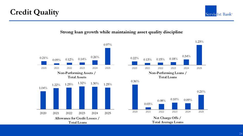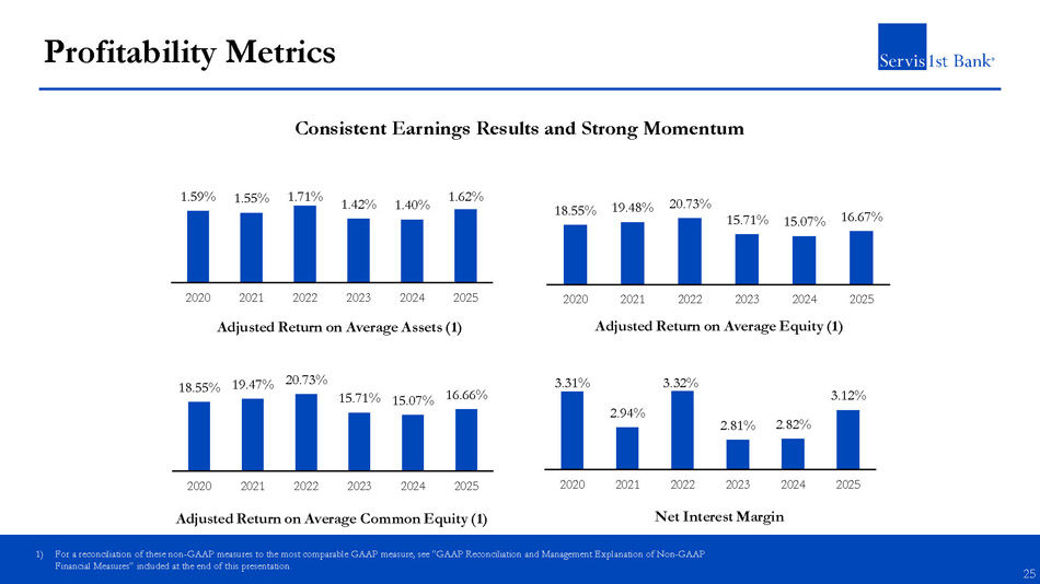 Strong loan growth while maintaining asset quality discipline Allowance for Credit Losses / Total Loans Net Charge Offs / Total Average Loans Non - Performing Assets / Total Assets Non - Performing Loans / Total Loans 0.21% 0.09% 0.12% 0.14% 0.26% 0.97% 2020 2021 2022 2023 2024 2025 0.22% 0.13% 0.15% 0.18% 0.34% 1.23% 2020 2021 2022 2023 2024 2025 0.36% 0.03% 0.08% 0.10% 0.09% 0.21% 2020 2021 2022 2023 2024 2025 1.04% 1.22% 1.25% 1.32% 1.30% 1.25% 2020 2021 2022 2023 2024 2025 Credit Quality 24