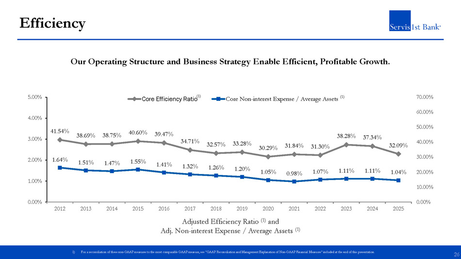 Consistent Earnings Results and Strong Momentum Adjusted Return on Average Assets (1) Adjusted Return on Average Equity (1) Adjusted Return on Average Common Equity (1) Net Interest Margin 1) For a reconciliation of these non - GAAP measures to the most comparable GAAP measure, see "GAAP Reconciliation and Management Exp lanation of Non - GAAP Financial Measures" included at the end of this presentation. 1.59% 1.55% 1.71% 1.42% 1.40% 1.62% 2020 2021 2022 2023 2024 2025 18.55% 19.47% 20.73% 15.71% 15.07% 16.66% 2020 2021 2022 2023 2024 2025 3.31% 2.94% 3.32% 2.81% 2.82% 3.12% 2020 2021 2022 2023 2024 2025 18.55% 19.48% 20.73% 15.71% 15.07% 16.67% 2020 2021 2022 2023 2024 2025 Profitability Metrics 25