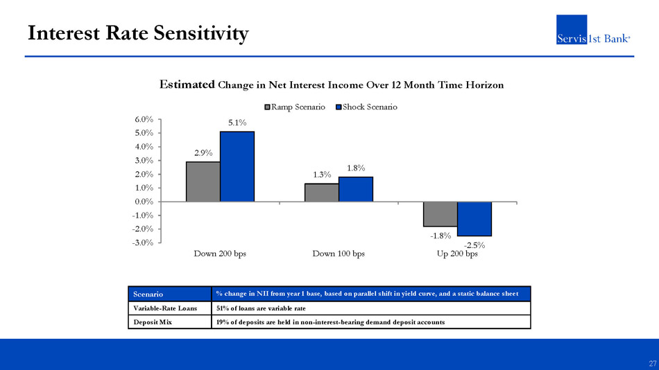 41.54% 38.69% 38.75% 40.60% 39.47% 34.71% 32.57% 33.28% 30.29% 31.84% 31.30% 38.28% 37.34% 32.09% 1.64% 1.51% 1.47% 1.55% 1.41% 1.32% 1.26% 1.20% 1.05% 0.98% 1.07% 1.11% 1.11% 1.04% 0.00% 1.00% 2.00% 3.00% 4.00% 5.00% 0.00% 10.00% 20.00% 30.00% 40.00% 50.00% 60.00% 70.00% 2012 2013 2014 2015 2016 2017 2018 2019 2020 2021 2022 2023 2024 2025 Core Efficiency Ratio Core Non-interest Expense / Average Assets Our Operating Structure and Business Strategy Enable Efficient, Profitable Growth. Adjusted Efficiency Ratio (1) and Adj. Non - interest Expense / Average Assets (1) (1) (1) 1) For a reconciliation of these non - GAAP measures to the most comparable GAAP measure, see "GAAP Reconciliation and Management Explanation of Non - GAAP Financial Measures" included at the end of this presentation . Efficiency 26