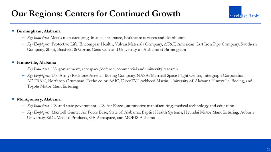 Estimated Change in Net Interest Income Over 12 Month Time Horizon % change in NII from year 1 base, b ased on parallel shift in yield curve, and a static balance sheet Scenario 51% of loans are variable rate Variable - Rate Loans 19% of deposits are held in non - interest - bearing demand deposit accounts Deposit Mix 2.9% 1.3% - 1.8% 5.1% 1.8% - 2.5% -3.0% -2.0% -1.0% 0.0% 1.0% 2.0% 3.0% 4.0% 5.0% 6.0% Down 200 bps Down 100 bps Up 200 bps Ramp Scenario Shock Scenario Interest Rate Sensitivity 27