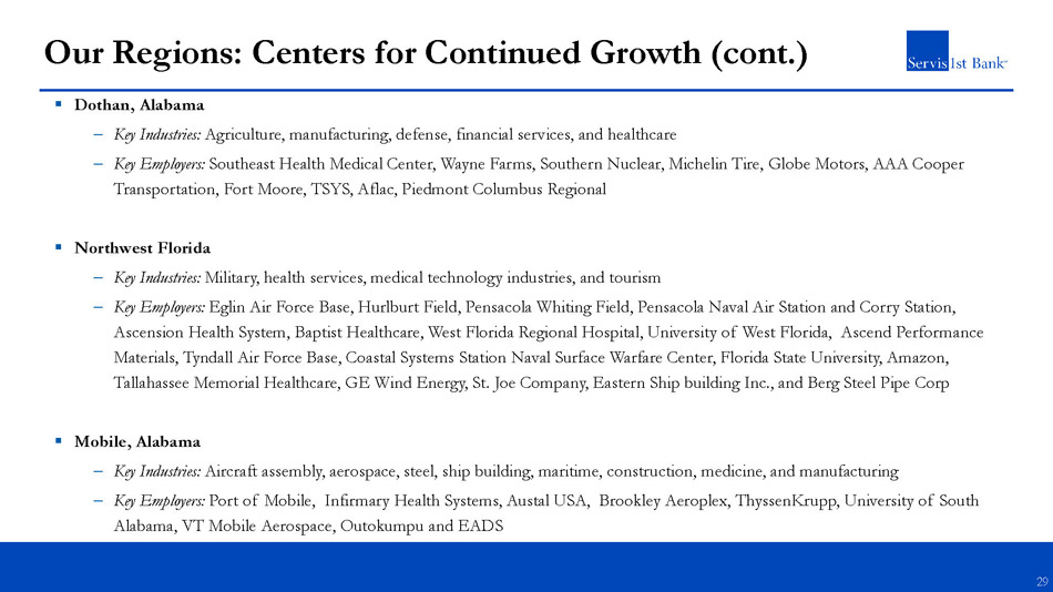 ▪ Birmingham, Alabama – Key Industries : Metals manufacturing, finance, insurance, healthcare services and distribution – Key Employers : Protective Life, Encompass Health, Vulcan Materials Company, AT&T, American Cast Iron Pipe Company, Southern Company, Shipt , Brasfield & Gorrie, Coca - Cola and University of Alabama at Birmingham ▪ Huntsville, Alabama – Key Industries : U.S. government, aerospace/defense, commercial and university research – Key Employers : U.S. Army/Redstone Arsenal, Boeing Company, NASA/Marshall Space Flight Center, Intergraph Corporation, ADTRAN, Northrop Grumman, Technicolor, SAIC, DirecTV, Lockheed Martin, University of Alabama Huntsville, Boeing, and Toyota Motor Manufacturing ▪ Montgomery, Alabama – Key Industries : U.S. and state government, U.S. Air Force , automotive manufacturing, medical technology and education – Key Employers : Maxwell Gunter Air Force Base, State of Alabama, Baptist Health Systems, Hyundai Motor Manufacturing, Auburn University, SiO2 Medical Products, GE Aerospace, and MOBIS Alabama Our Regions: Centers for Continued Growth 28