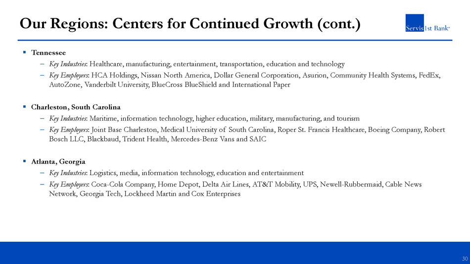 ▪ Dothan, Alabama – Key Industries: Agriculture, manufacturing, defense, financial services, and healthcare – Key Employers: Southeast Health Medical Center, Wayne Farms, Southern Nuclear, Michelin Tire, Globe Motors, AAA Cooper Transportation, Fort Moore, TSYS, Aflac, Piedmont Columbus Regional ▪ Northwest Florida – Key Industries: Military, health services, medical technology industries, and tourism – Key Employers: Eglin Air Force Base, Hurlburt Field, Pensacola Whiting Field, Pensacola Naval Air Station and Corry Station, Ascension Health System, Baptist Healthcare, West Florida Regional Hospital, University of West Florida, Ascend Performance Materials, Tyndall Air Force Base, Coastal Systems Station Naval Surface Warfare Center, Florida State University, Amazon, Tallahassee Memorial Healthcare, GE Wind Energy, St. Joe Company, Eastern Ship building Inc., and Berg Steel Pipe Corp ▪ Mobile, Alabama – Key Industries: Aircraft assembly, aerospace, steel, ship building, maritime, construction, medicine, and manufacturing – Key Employers: Port of Mobile, Infirmary Health Systems, Austal USA, Brookley Aeroplex, ThyssenKrupp, University of South Alabama, VT Mobile Aerospace, Outokumpu and EADS Our Regions: Centers for Continued Growth (cont.) 29