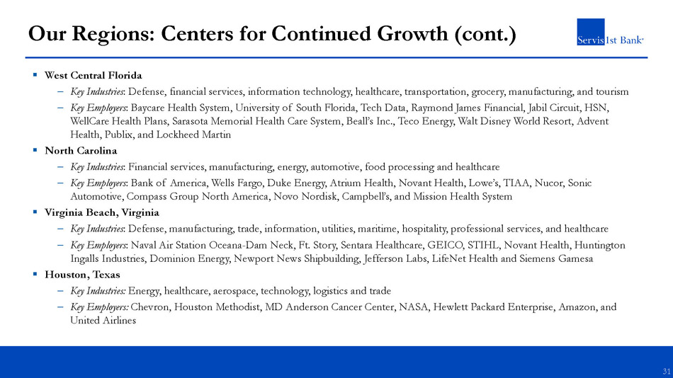 ▪ Tennessee – Key Industries : Healthcare, manufacturing, entertainment, transportation, education and technology – Key Employers : HCA Holdings, Nissan North America, Dollar General Corporation, Asurion, Community Health Systems, FedEx, AutoZone, Vanderbilt University, BlueCross BlueShield and International Paper ▪ Charleston, South Carolina – Key Industries : Maritime, information technology, higher education, military, manufacturing, and tourism – Key Employers : Joint Base Charleston, Medical University of South Carolina, Roper St. Francis Healthcare, Boeing Company, Robert Bosch LLC, Blackbaud, Trident Health, Mercedes - Benz Vans and SAIC ▪ Atlanta, Georgia – Key Industries : Logistics, media, information technology, education and entertainment – Key Employers : Coca - Cola Company, Home Depot, Delta Air Lines, AT&T Mobility, UPS, Newell - Rubbermaid, Cable News Network, Georgia Tech, Lockheed Martin and Cox Enterprises Our Regions: Centers for Continued Growth (cont.) 30