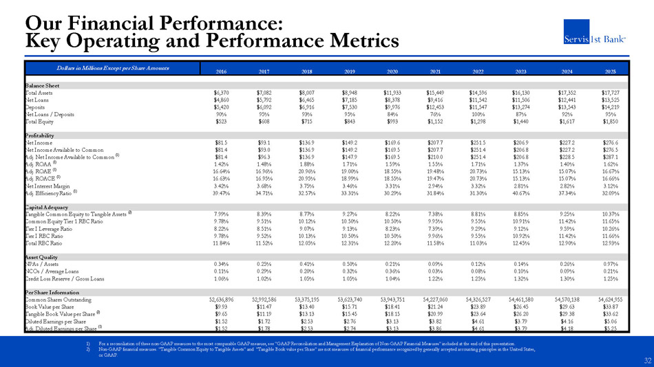 1) For a reconciliation of these non - GAAP measures to the most comparable GAAP measure, see "GAAP Reconciliation and Management Exp lanation of Non - GAAP Financial Measures" included at the end of this presentation. 2) Non - GAAP financial measures. "Tangible Common Equity to Tangible Assets" and "Tangible Book value per Share" are not measures o f financial performance recognized by generally accepted accounting principles in the United States, or GAAP. Dollars in Millions Except per Share Amounts 2025 2024 2023 2022 2021 2020 2019 2018 2017 2016 Balance Sheet $17,727 $17,352 $16,130 $14,596 $15,449 $11,933 $8,948 $8,007 $7,082 $6,370 Total Assets $13,525 $12,441 $11,506 $11,542 $9,416 $8,378 $7,185 $6,465 $5,792 $4,860 Net Loans $14,219 $13,543 $13,274 $11,547 $12,453 $9,976 $7,530 $6,916 $6,092 $5,420 Deposits 95% 92% 87% 100% 76% 84% 95% 93% 95% 90% Net Loans / Deposits $1,850 $1,617 $1,440 $1,298 $1,152 $993 $843 $715 $608 $523 Total Equity Profitability $276.6 $227.2 $206.9 $251.5 $207.7 $169.6 $149.2 $136.9 $93.1 $81.5 Net Income $276.5 $227.2 $206.8 $251.4 $207.7 $169.5 $149.2 $136.9 $93.0 $81.4 Net Income Available to Common $287.1 $228.5 $206.8 $251.4 $210.0 $169.5 $147.9 $136.9 $96.3 $81.4 Adj. Net Income Available to Common (1) 1.62% 1.40% 1.37% 1.71% 1.55% 1.59% 1.71% 1.88% 1.48% 1.42% Adj. ROAA (1) 16.67% 15.07% 15.13% 20.73% 19.48% 18.55% 19.00% 20.96% 16.96% 16.64% Adj. ROAE (1) 16.66% 15.07% 15.13% 20.73% 19.47% 18.55% 18.99% 20.95% 16.95% 16.63% Adj. ROACE (1) 3.12% 2.82% 2.81% 3.32% 2.94% 3.31% 3.46% 3.75% 3.68% 3.42% Net Interest Margin 32.09% 37.34% 40.67% 31.30% 31.84% 30.29% 33.31% 32.57% 34.71% 39.47% Adj. Efficiency Ratio (1) Capital Adequacy 10.37% 9.25% 8.85% 8.81% 7.38% 8.22% 9.27% 8.77% 8.39% 7.99% Tangible Common Equity to Tangible Assets (2) 11.65% 11.42% 10.91% 9.55% 9.95% 10.50% 10.50% 10.12% 9.51% 9.78% Common Equity Tier 1 RBC Ratio 10.26% 9.59% 9.12% 9.29% 7.39% 8.23% 9.13% 9.07% 8.51% 8.22% Tier I Leverage Ratio 11.66% 11.42% 10.92% 9.55% 9.96% 10.50% 10.50% 10.13% 9.52% 9.78% Tier I RBC Ratio 12.93% 12.90% 12.45% 11.03% 11.58% 12.20% 12.31% 12.05% 11.52% 11.84% Total RBC Ratio Asset Quality 0.97% 0.26% 0.14% 0.12% 0.09% 0.21% 0.50% 0.41% 0.25% 0.34% NPAs / Assets 0.21% 0.09% 0.10% 0.08% 0.03% 0.36% 0.32% 0.20% 0.29% 0.11% NCOs / Average Loans 1.25% 1.30% 1.32% 1.25% 1.22% 1.04% 1.05% 1.05% 1.02% 1.06% Credit Loss Reserve / Gross Loans Per Share Information 54,624,955 54,570,138 54,461,580 54,326,527 54,227,060 53,943,751 53,623,740 53,375,195 52,992,586 52,636,896 Common Shares Outstanding $33.87 $29.63 $26.45 $23.89 $21.24 $18.41 $15.71 $13.40 $11.47 $9.93 Book Value per Share $33.62 $29.38 $26.20 $23.64 $20.99 $18.15 $15.45 $13.13 $11.19 $9.65 Tangible Book Value per Share (2) $5.06 $4.16 $3.79 $4.61 $3.82 $3.13 $2.76 $2.53 $1.72 $1.52 Diluted Earnings per Share $5.25 $4.18 $3.79 $4.61 $3.86 $3.13 $2.74 $2.53 $1.78 $1.52 Adj. Diluted Earnings per Share (1) Our Financial Performance: Key Operating and Performance Metrics 32