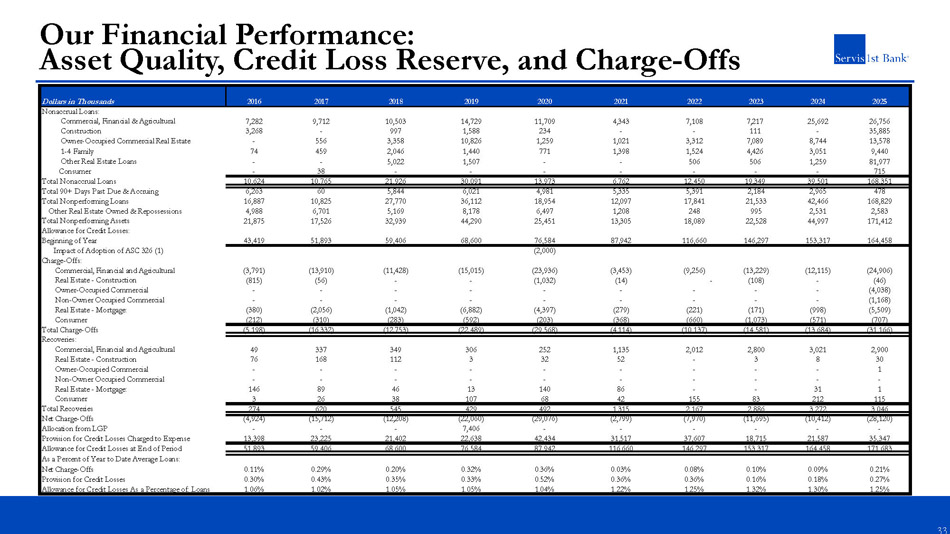 2025 2024 2023 2022 2021 2020 2019 2018 2017 2016 Dollars in Thousands Nonaccrual Loans: 26,756 25,692 7,217 7,108 4,343 11,709 14,729 10,503 9,712 7,282 Commercial, Financial & Agricultural 35,885 - 111 - - 234 1,588 997 - 3,268 Construction 13,578 8,744 7,089 3,312 1,021 1,259 10,826 3,358 556 - Owner - Occupied Commercial Real Estate 9,440 3,051 4,426 1,524 1,398 771 1,440 2,046 459 74 1 - 4 Family 81,977 1,259 506 506 - - 1,507 5,022 - - Other Real Estate Loans 715 - - - - - - - 38 - Consumer 168,351 39,501 19,349 12,450 6,762 13,973 30,091 21,926 10,765 10,624 Total Nonaccrual Loans 478 2,965 2,184 5,391 5,335 4,981 6,021 5,844 60 6,263 Total 90+ Days Past Due & Accruing 168,829 42,466 21,533 17,841 12,097 18,954 36,112 27,770 10,825 16,887 Total Nonperforming Loans 2,583 2,531 995 248 1,208 6,497 8,178 5,169 6,701 4,988 Other Real Estate Owned & Repossessions 171,412 44,997 22,528 18,089 13,305 25,451 44,290 32,939 17,526 21,875 Total Nonperforming Assets Allowance for Credit Losses: 164,458 153,317 146,297 116,660 87,942 76,584 68,600 59,406 51,893 43,419 Beginning of Year (2,000) Impact of Adoption of ASC 326 (1) Charge - Offs: (24,906) (12,115) (13,229) (9,256) (3,453) (23,936) (15,015) (11,428) (13,910) (3,791) Commercial, Financial and Agricultural (46) - (108) - (14) (1,032) - - (56) (815) Real Estate - Construction (4,038) - - - - - - - - - Owner - Occupied Commercial (1,168) - - - - - - - - - Non - Owner Occupied Commercial (5,509) (998) (171) (221) (279) (4,397) (6,882) (1,042) (2,056) (380) Real Estate - Mortgage: (707) (571) (1,073) (660) (368) (203) (592) (283) (310) (212) Consumer (31,166) (13,684) (14,581) (10,137) (4,114) (29,568) (22,489) (12,753) (16,332) (5,198) Total Charge - Offs Recoveries: 2,900 3,021 2,800 2,012 1,135 252 306 349 337 49 Commercial, Financial and Agricultural 30 8 3 - 52 32 3 112 168 76 Real Estate - Construction 1 - - - - - - - - - Owner - Occupied Commercial - - - - - - - - - - Non - Owner Occupied Commercial 1 31 - - 86 140 13 46 89 146 Real Estate - Mortgage: 115 212 83 155 42 68 107 38 26 3 Consumer 3,046 3,272 2,886 2,167 1,315 492 429 545 620 274 Total Recoveries (28,120) (10,412) (11,695) (7,970) (2,799) (29,076) (22,060) (12,208) (15,712) (4,924) Net Charge - Offs - - - - - - 7,406 - - - Allocation from LGP 35,347 21,587 18,715 37,607 31,517 42,434 22,638 21,402 23,225 13,398 Provision for Credit Losses Charged to Expense 171,683 164,458 153,317 146,297 116,660 87,942 76,584 68,600 59,406 51,893 Allowance for Credit Losses at End of Period As a Percent of Year to Date Average Loans: 0.21% 0.09% 0.10% 0.08% 0.03% 0.36% 0.32% 0.20% 0.29% 0.11% Net Charge - Offs 0.27% 0.18% 0.16% 0.36% 0.36% 0.52% 0.33% 0.35% 0.43% 0.30% Provision for Credit Losses 1.25% 1.30% 1.32% 1.25% 1.22% 1.04% 1.05% 1.05% 1.02% 1.06% Allowance for Credit Losses As a Percentage of: Loans Our Financial Performance: Asset Quality, Credit Loss Reserve, and Charge - Offs 33