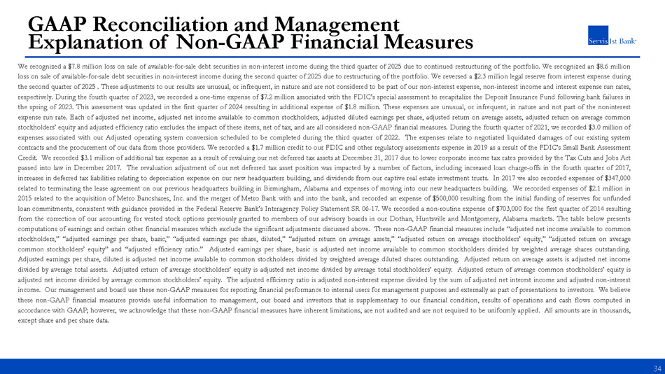 GAAP Reconciliation and Management Explanation of Non - GAAP Financial Measures We recognized a $ 7 . 8 million loss on sale of available - for - sale debt securities in non - interest income during the third quarter of 2025 due to continued restructuring of the portfolio . We recognized an $ 8 . 6 million loss on sale of available - for - sale debt securities in non - interest income during the second quarter of 2025 due to restructuring of the portfolio . We reversed a $ 2 . 3 million legal reserve from interest expense during the second quarter of 2025 . These adjustments to our results are unusual, or infrequent, in nature and are not considered to be part of our non - interest expense, non - interest income and interest expense run rates, respectively . During the fourth quarter of 2023 , we recorded a one - time expense of $ 7 . 2 million associated with the FDIC’s special assessment to recapitalize the Deposit Insurance Fund following bank failures in the spring of 2023 . This assessment was updated in the first quarter of 2024 resulting in additional expense of $ 1 . 8 million . These expenses are unusual, or infrequent, in nature and not part of the noninterest expense run rate . Each of adjusted net income, adjusted net income available to common stockholders, adjusted diluted earnings per share, adjusted return on average assets, adjusted return on average common stockholders’ equity and adjusted efficiency ratio excludes the impact of these items, net of tax, and are all considered non - GAAP financial measures . During the fourth quarter of 2021 , we recorded $ 3 . 0 million of expenses associated with our Adjusted operating system conversion scheduled to be completed during the third quarter of 2022 . The expenses relate to negotiated liquidated damages of our existing system contracts and the procurement of our data from those providers . We recorded a $ 1 . 7 million credit to our FDIC and other regulatory assessments expense in 2019 as a result of the FDIC’s Small Bank Assessment Credit . We recorded $ 3 . 1 million of additional tax expense as a result of revaluing our net deferred tax assets at December 31 , 2017 due to lower corporate income tax rates provided by the Tax Cuts and Jobs Act passed into law in December 2017 . The revaluation adjustment of our net deferred tax asset position was impacted by a number of factors, including increased loan charge - offs in the fourth quarter of 2017 , increases in deferred tax liabilities relating to depreciation expense on our new headquarters building, and dividends from our captive real estate investment trusts . In 2017 we also recorded expenses of $ 347 , 000 related to terminating the lease agreement on our previous headquarters building in Birmingham, Alabama and expenses of moving into our new headquarters building . We recorded expenses of $ 2 . 1 million in 2015 related to the acquisition of Metro Bancshares, Inc . and the merger of Metro Bank with and into the bank, and recorded an expense of $ 500 , 000 resulting from the initial funding of reserves for unfunded loan commitments, consistent with guidance provided in the Federal Reserve Bank’s Interagency Policy Statement SR 06 - 17 . We recorded a non - routine expense of $ 703 , 000 for the first quarter of 2014 resulting from the correction of our accounting for vested stock options previously granted to members of our advisory boards in our Dothan, Huntsville and Montgomery, Alabama markets . The table below presents computations of earnings and certain other financial measures which exclude the significant adjustments discussed above . These non - GAAP financial measures include “adjusted net income available to common stockholders,” “adjusted earnings per share, basic,” “adjusted earnings per share, diluted,” “adjusted return on average assets,” “adjusted return on average stockholders’ equity,” “adjusted return on average common stockholders’ equity” and “adjusted efficiency ratio . ” Adjusted earnings per share, basic is adjusted net income available to common stockholders divided by weighted average shares outstanding . Adjusted earnings per share, diluted is adjusted net income available to common stockholders divided by weighted average diluted shares outstanding . Adjusted return on average assets is adjusted net income divided by average total assets . Adjusted return of average stockholders’ equity is adjusted net income divided by average total stockholders’ equity . Adjusted return of average common stockholders’ equity is adjusted net income divided by average common stockholders’ equity . The adjusted efficiency ratio is adjusted non - interest expense divided by the sum of adjusted net interest income and adjusted non - interest income . Our management and board use these non - GAAP measures for reporting financial performance to internal users for management purposes and externally as part of presentations to investors . We believe these non - GAAP financial measures provide useful information to management, our board and investors that is supplementary to our financial condition, results of operations and cash flows computed in accordance with GAAP ; however, we acknowledge that these non - GAAP financial measures have inherent limitations, are not audited and are not required to be uniformly applied . All amounts are in thousands, except share and per share data . 34