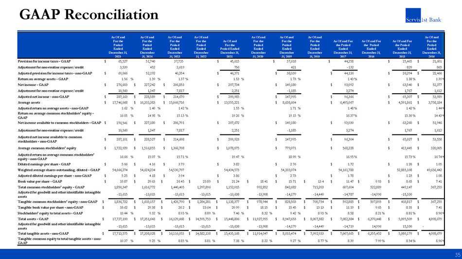 As Of and For the Period Ended December 31, 2014 As Of and For the Period Ended December 31, 2015 As Of and For the Period Ended December 31, 2016 As Of and For the Period Ended December 31, 2017 As Of and For the Period Ended December 31, 2018 As Of and For the Period Ended December 31, 2019 As Of and For the Period Ended December 31, 2020 As Of and For the Period Ended December 31, 2021 As Of and For the Period Ended December 31, 2022 As Of and For the Period Ended December 31, 2023 As Of and For the Period Ended December 31, 2024 As Of and For the Period Ended December 31, 2025 21,601 $ 25,465 $ 44,258 $ 37,618 $ 45,615 $ 37,735 51,740 65,527 $ Provision for income taxes - GAAP 865 829 - 132 421 756 2,619 452 3,539 Adjustment for non - routine expense/credit 22,466 $ 26,294 $ 44,126 $ 38,039 $ 46,371 $ 40,354 52,192 69,066 $ Adjusted provision for income taxes - non - GAAP % 1.39 % 1.38 % 1.43 % 1.73 % 1.53 % 1.37 % 1.39 % 1.56 Return on average assets - GAAP 52,377 $ 63,540 $ 93,092 $ 149,180 $ 207,734 $ 206,853 $ 227,242 $ 276,603 $ Net income - GAAP 1,612 1,767 3,274 - 1,185 2,251 7,817 1,347 10,560 Adjustment for non - routine expense/credit 53,989 $ 65,307 $ 96,366 $ 147,995 $ 209,985 $ 214,670 $ 228,589 $ 287,163 $ Adjusted net income - non - GAAP 3,758,184 $ 4,591,861 $ 6,495,067 $ 8,638,604 $ 13,555,221 $ 15,066,716 $ 16,333,383 $ 17,746,068 $ Average assets % 1.44 % 1.42 % 1.48 % 1.71 % 1.55 % 1.42 % 1.40 % 1.62 Adjusted return on average assets - non - GAAP % 14.43 % 15.30 % 16.37 % 19.15 % 19.26 % 15.13 % 14.98 % 16.05 Return on average common stockholders' equity - GAAP 51,946 $ 63,260 $ 93,030 $ 149,180 $ 207,672 $ 206,791 $ 227,180 $ 276,541 $ Net income available to common stockholders - GAAP 1,612 1,767 3,274 - 1,185 2,251 7,817 1,347 10,560 Adjustment for non - routine expense/credit 53,558 $ 65,027 $ 96,304 $ 147,995 $ 209,923 $ 214,608 $ 228,527 $ 287,101 $ Adjusted net income available to common stockholders - non - GAAP 320,005 $ 413,445 $ 568,228 $ 779,071 $ 1,078,075 $ 1,366,708 $ 1,516,855 $ 1,722,929 $ Average common stockholders' equity % 16.74 % 15.73 % 16.95 % 18.99 % 19.47 % 15.71 % 15.07 % 16.66 Adjusted return on average common stockholders' equity - non - GAAP 1.05 $ 1.20 $ 1.72 $ 2.76 $ 3.82 $ 3.79 $ 4.16 $ 5.06 $ Diluted earnings per share - GAAP 49,636,442 52,885,108 54,161,788 54,103,074 54,434,573 54,530,797 54,624,234 54,666,274 Weighted average shares outstanding, diluted - GAAP 1.08 $ 1.23 $ 1.78 $ 2.73 $ 3.86 $ 3.94 $ 4.18 $ 5.25 $ Adjusted diluted earnings per share - non - GAAP 7.41 $ 8.65 $ 9.93 $ 11.47 $ 13.4 $ 15.71 $ 18.41 $ 21.24 $ 23.89 $ 26.45 $ 29.63 $ 33.87 $ Book value per share - GAAP 367,255 449,147 522,889 607,604 715,203 842,682 992,852 1,152,015 1,297,896 1,440,405 1,616,772 1,850,347 Total common stockholders' equity - GAAP - 15,330 - 14,996 - 14,787 - 14,449 - 14,179 - 13,908 - 13,638 - 13,615 - 13,615 - 13,615 - 13,615 Adjusted for goodwill and other identifiable intangible assets 367,255 $ 433,817 $ 507,893 $ 592,885 $ 700,754 $ 828,503 $ 978,944 $ 1,138,377 $ 1,284,281 $ 1,426,790 $ 1,603,157 $ 1,836,732 $ Tangible common stockholders' equity - non - GAAP 7.41 $ 8.35 $ 9.65 $ 11.19 $ 13.13 $ 15.45 $ 18.15 $ 20.99 $ 23.64 $ 26.2 $ 29.38 $ 33.62 $ Tangible book value per share - non - GAAP % 8.96 % 8.81 % 8.21 8.58 % 8.93 % 9.42 % 8.32 % 7.46 % 8.89 % 8.93 % 9.32 % 10.44 Stockholders' equity to total assets - GAAP 4,098,679 $ 5,095,509 $ 6,370,448 $ 7,082,384 $ 8,007,382 $ 8,947,653 $ 11,927,955 $ 15,448,806 $ 14,595,753 $ 16,129,668 $ 17,351,643 $ 17,727,190 $ Total assets - GAAP - 15,330 14,996 - 14,719 - 14,449 - 14,179 - 13,908 - 13,638 - 13,615 - 13,615 - 13,615 - 13,615 Adjusted for goodwill and other identifiable intangible assets 4,098,679 $ 5,080,179 $ 6,355,452 $ 7,067,665 $ 7,992,933 $ 8,933,474 $ 11,914,047 $ 15,435,168 $ 14,582,138 $ 16,116,053 $ 17,338,028 $ 17,713,575 $ Total tangible assets - non - GAAP % 8.96 % 8.54 % 7.99 8.39 % 8.77 % 9.27 % 8.22 % 7.38 % 8.81 % 8.85 % 9.25 % 10.37 Tangible common equity to total tangible assets - non - GAAP GAAP Reconciliation 35