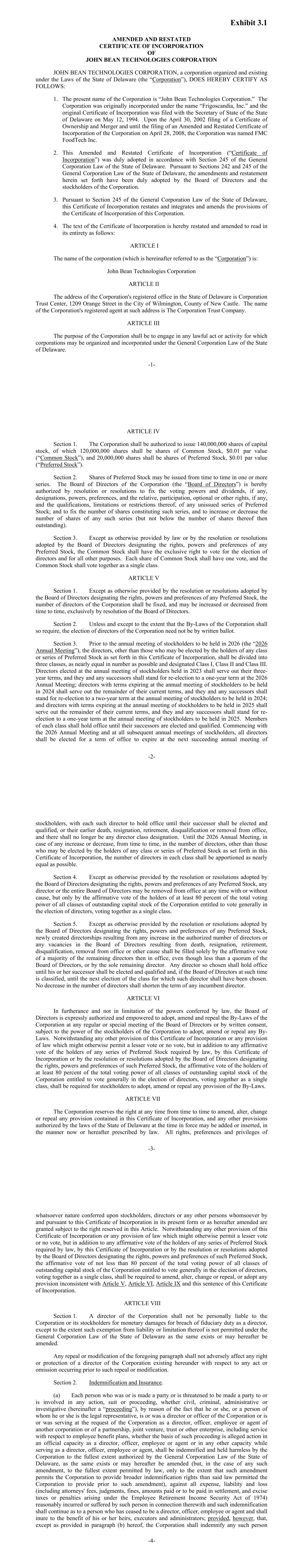 Exhibit 3.1 -1- AMENDED AND RESTATED CERTIFICATE OF INCORPORATION OF JOHN BEAN TECHNOLOGIES CORPORATION JOHN BEAN TECHNOLOGIES CORPORATION, a corporation organized and existing under the Laws of the State of Delaware (the “Corporation”), DOES HEREBY CERTIFY AS FOLLOWS: 1. The present name of the Corporation is “John Bean Technologies Corporation.” The Corporation was originally incorporated under the name “Frigoscandia, Inc.” and the original Certificate of Incorporation was filed with the Secretary of State of the State of Delaware on May 12, 1994. Upon the April 30, 2002 filing of a Certificate of Ownership and Merger and until the filing of an Amended and Restated Certificate of Incorporation of the Corporation on April 28, 2008, the Corporation was named FMC FoodTech Inc. 2. This Amended and Restated Certificate of Incorporation (“Certificate of Incorporation”) was duly adopted in accordance with Section 245 of the General Corporation Law of the State of Delaware. Pursuant to Sections 242 and 245 of the General Corporation Law of the State of Delaware, the amendments and restatement herein set forth have been duly adopted by the Board of Directors and the stockholders of the Corporation. 3. Pursuant to Section 245 of the General Corporation Law of the State of Delaware, this Certificate of Incorporation restates and integrates and amends the provisions of the Certificate of Incorporation of this Corporation. 4. The text of the Certificate of Incorporation is hereby restated and amended to read in its entirety as follows: ARTICLE I The name of the corporation (which is hereinafter referred to as the “Corporation”) is: John Bean Technologies Corporation ARTICLE II The address of the Corporation's registered office in the State of Delaware is Corporation Trust Center, 1209 Orange Street in the City of Wilmington, County of New Castle. The name of the Corporation's registered agent at such address is The Corporation Trust Company. ARTICLE III The purpose of the Corporation shall be to engage in any lawful act or activity for which corporations may be organized and incorporated under the General Corporation Law of the State of Delaware. -2- ARTICLE IV Section 1. The Corporation shall be authorized to issue 140,000,000 shares of capital stock, of which 120,000,000 shares shall be shares of Common Stock, $0.01 par value (“Common Stock”), and 20,000,000 shares shall be shares of Preferred Stock, $0.01 par value (“Preferred Stock”). Section 2. Shares of Preferred Stock may be issued from time to time in one or more series. The Board of Directors of the Corporation (the “Board of Directors”) is hereby authorized by resolution or resolutions to fix the voting powers and dividends, if any, designations, powers, preferences, and the relative, participation, optional or other rights, if any, and the qualifications, limitations or restrictions thereof, of any unissued series of Preferred Stock; and to fix the number of shares constituting such series, and to increase or decrease the number of shares of any such series (but not below the number of shares thereof then outstanding). Section 3. Except as otherwise provided by law or by the resolution or resolutions adopted by the Board of Directors designating the rights, powers and preferences of any Preferred Stock, the Common Stock shall have the exclusive right to vote for the election of directors and for all other purposes. Each share of Common Stock shall have one vote, and the Common Stock shall vote together as a single class. ARTICLE V Section 1. Except as otherwise provided by the resolution or resolutions adopted by the Board of Directors designating the rights, powers and preferences of any Preferred Stock, the number of directors of the Corporation shall be fixed, and may be increased or decreased from time to time, exclusively by resolution of the Board of Directors. Section 2. Unless and except to the extent that the By-Laws of the Corporation shall so require, the election of directors of the Corporation need not be by written ballot. Section 3. Prior to the annual meeting of stockholders to be held in 2026 (the “2026 Annual Meeting”), the directors, other than those who may be elected by the holders of any class or series of Preferred Stock as set forth in this Certificate of Incorporation, shall be divided into three classes, as nearly equal in number as possible and designated Class I, Class II and Class III. Directors elected at the annual meeting of stockholders held in 2023 shall serve out their three- year terms, and they and any successors shall stand for re-election to a one-year term at the 2026 Annual Meeting; directors with terms expiring at the annual meeting of stockholders to be held in 2024 shall serve out the remainder of their current terms, and they and any successors shall stand for re-election to a two-year term at the annual meeting of stockholders to be held in 2024; and directors with terms expiring at the annual meeting of stockholders to be held in 2025 shall serve out the remainder of their current terms, and they and any successors shall stand for re- election to a one-year term at the annual meeting of stockholders to be held in 2025. Members of each class shall hold office until their successors are elected and qualified. Commencing with the 2026 Annual Meeting and at all subsequent annual meetings of stockholders, all directors shall be elected for a term of office to expire at the next succeeding annual meeting of -3- stockholders, with each such director to hold office until their successor shall be elected and qualified, or their earlier death, resignation, retirement, disqualification or removal from office, and there shall no longer be any director class designation. Until the 2026 Annual Meeting, in case of any increase or decrease, from time to time, in the number of directors, other than those who may be elected by the holders of any class or series of Preferred