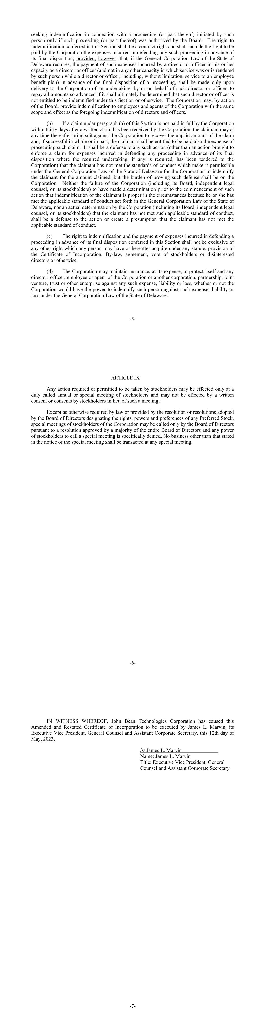 -5- seeking indemnification in connection with a proceeding (or part thereof) initiated by such person only if such proceeding (or part thereof) was authorized by the Board. The right to indemnification conferred in this Section shall be a contract right and shall include the right to be paid by the Corporation the expenses incurred in defending any such proceeding in advance of its final disposition; provided, however, that, if the General Corporation Law of the State of Delaware requires, the payment of such expenses incurred by a director or officer in his or her capacity as a director or officer (and not in any other capacity in which service was or is rendered by such person while a director or officer, including, without limitation, service to an employee benefit plan) in advance of the final disposition of a proceeding, shall be made only upon delivery to the Corporation of an undertaking, by or on behalf of such director or officer, to repay all amounts so advanced if it shall ultimately be determined that such director or officer is not entitled to be indemnified under this Section or otherwise. The Corporation may, by action of the Board, provide indemnification to employees and agents of the Corporation with the same scope and effect as the foregoing indemnification of directors and officers. (b) If a claim under paragraph (a) of this Section is not paid in full by the Corporation within thirty days after a written claim has been received by the Corporation, the claimant may at any time thereafter bring suit against the Corporation to recover the unpaid amount of the claim and, if successful in whole or in part, the claimant shall be entitled to be paid also the expense of prosecuting such claim. It shall be a defense to any such action (other than an action brought to enforce a claim for expenses incurred in defending any proceeding in advance of its final disposition where the required undertaking, if any is required, has been tendered to the Corporation) that the claimant has not met the standards of conduct which make it permissible under the General Corporation Law of the State of Delaware for the Corporation to indemnify the claimant for the amount claimed, but the burden of proving such defense shall be on the Corporation. Neither the failure of the Corporation (including its Board, independent legal counsel, or its stockholders) to have made a determination prior to the commencement of such action that indemnification of the claimant is proper in the circumstances because he or she has met the applicable standard of conduct set forth in the General Corporation Law of the State of Delaware, nor an actual determination by the Corporation (including its Board, independent legal counsel, or its stockholders) that the claimant has not met such applicable standard of conduct, shall be a defense to the action or create a presumption that the claimant has not met the applicable standard of conduct. (c) The right to indemnification and the payment of expenses incurred in defending a proceeding in advance of its final disposition conferred in this Section shall not be exclusive of any other right which any person may have or hereafter acquire under any statute, provision of the Certificate of Incorporation, By-law, agreement, vote of stockholders or disinterested directors or otherwise. (d) The Corporation may maintain insurance, at its expense, to protect itself and any director, officer, employee or agent of the Corporation or another corporation, partnership, joint venture, trust or other enterprise against any such expense, liability or loss, whether or not the Corporation would have the power to indemnify such person against such expense, liability or loss under the General Corporation Law of the State of Delaware. -6- ARTICLE IX Any action required or permitted to be taken by stockholders may be effected only at a duly called annual or special meeting of stockholders and may not be effected by a written consent or consents by stockholders in lieu of such a meeting. Except as otherwise required by law or provided by the resolution or resolutions adopted by the Board of Directors designating the rights, powers and preferences of any Preferred Stock, special meetings of stockholders of the Corporation may be called only by the Board of Directors pursuant to a resolution approved by a majority of the entire Board of Directors and any power of stockholders to call a special meeting is specifically denied. No business other than that stated in the notice of the special meeting shall be transacted at any special meeting. -7- IN WITNESS WHEREOF, John Bean Technologies Corporation has caused this Amended and Restated Certificate of Incorporation to be executed by James L. Marvin, its Executive Vice President, General Counsel and Assistant Corporate Secretary, this 12th day of May, 2023. /s/ James L. Marvin Name: James L. Marvin Title: Executive Vice President, General Counsel and Assistant Corporate Secretary
