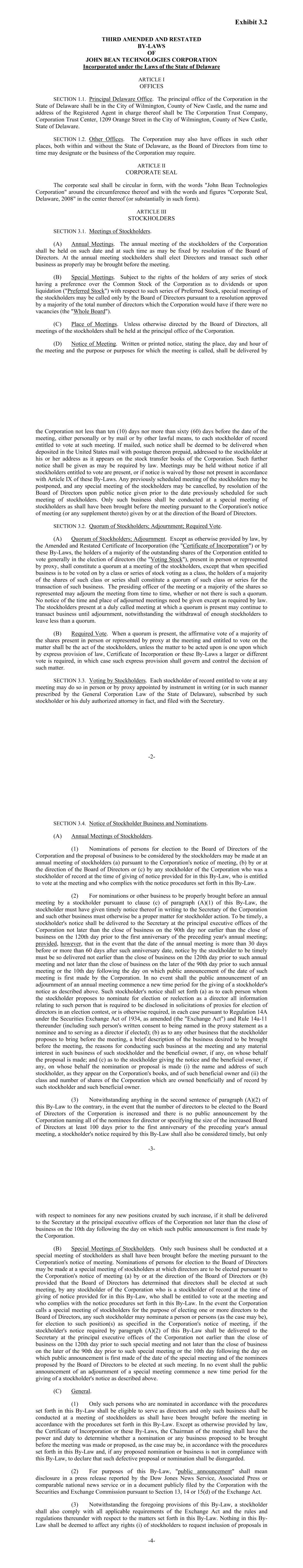 Exhibit 3.2 THIRD AMENDED AND RESTATED BY-LAWS OF JOHN BEAN TECHNOLOGIES CORPORATION Incorporated under the Laws of the State of Delaware ARTICLE I OFFICES SECTION 1.1. Principal Delaware Office. The principal office of the Corporation in the State of Delaware shall be in the City of Wilmington, County of New Castle, and the name and address of the Registered Agent in charge thereof shall be The Corporation Trust Company, Corporation Trust Center, 1209 Orange Street in the City of Wilmington, County of New Castle, State of Delaware. SECTION 1.2. Other Offices. The Corporation may also have offices in such other places, both within and without the State of Delaware, as the Board of Directors from time to time may designate or the business of the Corporation may require. ARTICLE II CORPORATE SEAL The corporate seal shall be circular in form, with the words "John Bean Technologies Corporation" around the circumference thereof and with the words and figures "Corporate Seal, Delaware, 2008" in the center thereof (or substantially in such form). ARTICLE III STOCKHOLDERS SECTION 3.1. Meetings of Stockholders. (A) Annual Meetings. The annual meeting of the stockholders of the Corporation shall be held on such date and at such time as may be fixed by resolution of the Board of Directors. At the annual meeting stockholders shall elect Directors and transact such other business as properly may be brought before the meeting. (B) Special Meetings. Subject to the rights of the holders of any series of stock having a preference over the Common Stock of the Corporation as to dividends or upon liquidation ("Preferred Stock") with respect to such series of Preferred Stock, special meetings of the stockholders may be called only by the Board of Directors pursuant to a resolution approved by a majority of the total number of directors which the Corporation would have if there were no vacancies (the "Whole Board"). (C) Place of Meetings. Unless otherwise directed by the Board of Directors, all meetings of the stockholders shall be held at the principal office of the Corporation. (D) Notice of Meeting. Written or printed notice, stating the place, day and hour of the meeting and the purpose or purposes for which the meeting is called, shall be delivered by -2- the Corporation not less than ten (10) days nor more than sixty (60) days before the date of the meeting, either personally or by mail or by other lawful means, to each stockholder of record entitled to vote at such meeting. If mailed, such notice shall be deemed to be delivered when deposited in the United States mail with postage thereon prepaid, addressed to the stockholder at his or her address as it appears on the stock transfer books of the Corporation. Such further notice shall be given as may be required by law. Meetings may be held without notice if all stockholders entitled to vote are present, or if notice is waived by those not present in accordance with Article IX of these By-Laws. Any previously scheduled meeting of the stockholders may be postponed, and any special meeting of the stockholders may be cancelled, by resolution of the Board of Directors upon public notice given prior to the date previously scheduled for such meeting of stockholders. Only such business shall be conducted at a special meeting of stockholders as shall have been brought before the meeting pursuant to the Corporation's notice of meeting (or any supplement thereto) given by or at the direction of the Board of Directors. SECTION 3.2. Quorum of Stockholders; Adjournment; Required Vote. (A) Quorum of Stockholders; Adjournment. Except as otherwise provided by law, by the Amended and Restated Certificate of Incorporation (the "Certificate of Incorporation") or by these By-Laws, the holders of a majority of the outstanding shares of the Corporation entitled to vote generally in the election of directors (the "Voting Stock"), present in person or represented by proxy, shall constitute a quorum at a meeting of the stockholders, except that when specified business is to be voted on by a class or series of stock voting as a class, the holders of a majority of the shares of such class or series shall constitute a quorum of such class or series for the transaction of such business. The presiding officer of the meeting or a majority of the shares so represented may adjourn the meeting from time to time, whether or not there is such a quorum. No notice of the time and place of adjourned meetings need be given except as required by law. The stockholders present at a duly called meeting at which a quorum is present may continue to transact business until adjournment, notwithstanding the withdrawal of enough stockholders to leave less than a quorum. (B) Required Vote. When a quorum is present, the affirmative vote of a majority of the shares present in person or represented by proxy at the meeting and entitled to vote on the matter shall be the act of the stockholders, unless the matter to be acted upon is one upon which by express provision of law, Certificate of Incorporation or these By-Laws a larger or different vote is required, in which case such express provision shall govern and control the decision of such matter. SECTION 3.3. Voting by Stockholders. Each stockholder of record entitled to vote at any meeting may do so in person or by proxy appointed by instrument in writing (or in such manner prescribed by the General Corporation Law of the State of Delaware), subscribed by such stockholder or his duly authorized attorney in fact, and filed with the Secretary. -3- SECTION 3.4. Notice of Stockholder Business and Nominations. (A) Annual Meetings of Stockholders. (1) Nominations of persons for election to the Board of Directors of the Corporation and the proposal of business to be considered by the stockholders may be made at an annual meeting of stockholders (a) pursuant to the Corporation's notice of meeting, (b) by or at the direction of the Board of Directors or (c) by an