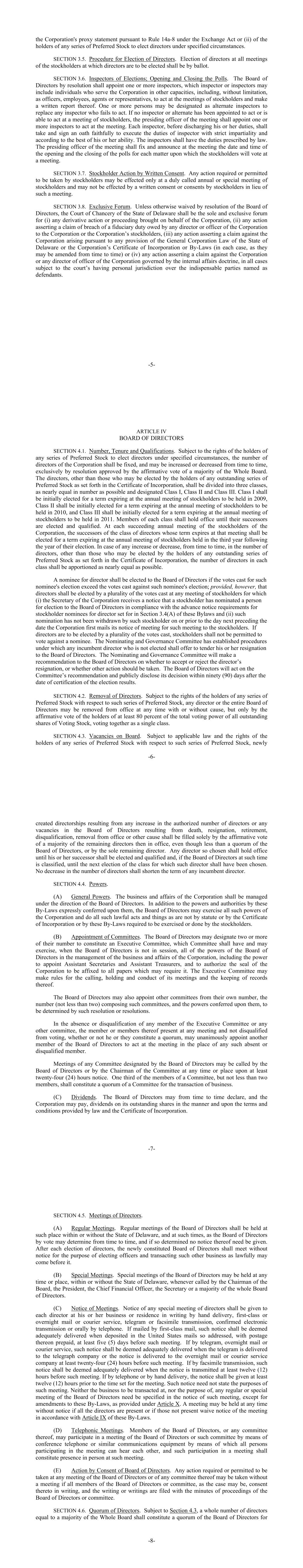 -5- the Corporation's proxy statement pursuant to Rule 14a-8 under the Exchange Act or (ii) of the holders of any series of Preferred Stock to elect directors under specified circumstances. SECTION 3.5. Procedure for Election of Directors. Election of directors at all meetings of the stockholders at which directors are to be elected shall be by ballot. SECTION 3.6. Inspectors of Elections; Opening and Closing the Polls. The Board of Directors by resolution shall appoint one or more inspectors, which inspector or inspectors may include individuals who serve the Corporation in other capacities, including, without limitation, as officers, employees, agents or representatives, to act at the meetings of stockholders and make a written report thereof. One or more persons may be designated as alternate inspectors to replace any inspector who fails to act. If no inspector or alternate has been appointed to act or is able to act at a meeting of stockholders, the presiding officer of the meeting shall appoint one or more inspectors to act at the meeting. Each inspector, before discharging his or her duties, shall take and sign an oath faithfully to execute the duties of inspector with strict impartiality and according to the best of his or her ability. The inspectors shall have the duties prescribed by law. The presiding officer of the meeting shall fix and announce at the meeting the date and time of the opening and the closing of the polls for each matter upon which the stockholders will vote at a meeting. SECTION 3.7. Stockholder Action by Written Consent. Any action required or permitted to be taken by stockholders may be effected only at a duly called annual or special meeting of stockholders and may not be effected by a written consent or consents by stockholders in lieu of such a meeting. SECTION 3.8. Exclusive Forum. Unless otherwise waived by resolution of the Board of Directors, the Court of Chancery of the State of Delaware shall be the sole and exclusive forum for (i) any derivative action or proceeding brought on behalf of the Corporation, (ii) any action asserting a claim of breach of a fiduciary duty owed by any director or officer of the Corporation to the Corporation or the Corporation’s stockholders, (iii) any action asserting a claim against the Corporation arising pursuant to any provision of the General Corporation Law of the State of Delaware or the Corporation’s Certificate of Incorporation or By-Laws (in each case, as they may be amended from time to time) or (iv) any action asserting a claim against the Corporation or any director of officer of the Corporation governed by the internal affairs doctrine, in all cases subject to the court’s having personal jurisdiction over the indispensable parties named as defendants. -6- ARTICLE IV BOARD OF DIRECTORS SECTION 4.1. Number, Tenure and Qualifications. Subject to the rights of the holders of any series of Preferred Stock to elect directors under specified circumstances, the number of directors of the Corporation shall be fixed, and may be increased or decreased from time to time, exclusively by resolution approved by the affirmative vote of a majority of the Whole Board. The directors, other than those who may be elected by the holders of any outstanding series of Preferred Stock as set forth in the Certificate of Incorporation, shall be divided into three classes, as nearly equal in number as possible and designated Class I, Class II and Class III. Class I shall be initially elected for a term expiring at the annual meeting of stockholders to be held in 2009, Class II shall be initially elected for a term expiring at the annual meeting of stockholders to be held in 2010, and Class III shall be initially elected for a term expiring at the annual meeting of stockholders to be held in 2011. Members of each class shall hold office until their successors are elected and qualified. At each succeeding annual meeting of the stockholders of the Corporation, the successors of the class of directors whose term expires at that meeting shall be elected for a term expiring at the annual meeting of stockholders held in the third year following the year of their election. In case of any increase or decrease, from time to time, in the number of directors, other than those who may be elected by the holders of any outstanding series of Preferred Stock as set forth in the Certificate of Incorporation, the number of directors in each class shall be apportioned as nearly equal as possible. A nominee for director shall be elected to the Board of Directors if the votes cast for such nominee's election exceed the votes cast against such nominee's election; provided, however, that directors shall be elected by a plurality of the votes cast at any meeting of stockholders for which (i) the Secretary of the Corporation receives a notice that a stockholder has nominated a person for election to the Board of Directors in compliance with the advance notice requirements for stockholder nominees for director set for in Section 3.4(A) of these Bylaws and (ii) such nomination has not been withdrawn by such stockholder on or prior to the day next preceding the date the Corporation first mails its notice of meeting for such meeting to the stockholders. If directors are to be elected by a plurality of the votes cast, stockholders shall not be permitted to vote against a nominee. The Nominating and Governance Committee has established procedures under which any incumbent director who is not elected shall offer to tender his or her resignation to the Board of Directors. The Nominating and Governance Committee will make a recommendation to the Board of Directors on whether to accept or reject the director’s resignation, or whether other action should be taken. The Board of Directors will act on the Committee’s recommendation and publicly disclose its decision within ninety (90) days after the date of certification of the election results. SECTION 4.2. Remova