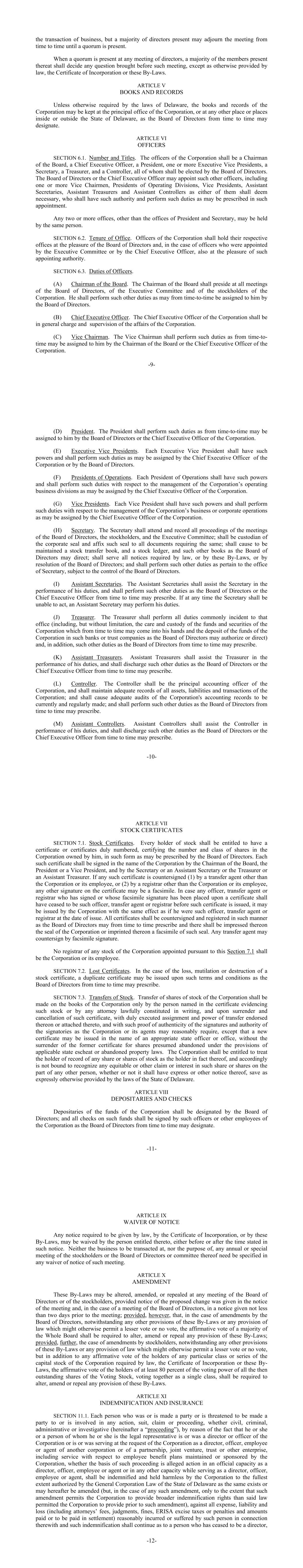 -9- the transaction of business, but a majority of directors present may adjourn the meeting from time to time until a quorum is present. When a quorum is present at any meeting of directors, a majority of the members present thereat shall decide any question brought before such meeting, except as otherwise provided by law, the Certificate of Incorporation or these By-Laws. ARTICLE V BOOKS AND RECORDS Unless otherwise required by the laws of Delaware, the books and records of the Corporation may be kept at the principal office of the Corporation, or at any other place or places inside or outside the State of Delaware, as the Board of Directors from time to time may designate. ARTICLE VI OFFICERS SECTION 6.1. Number and Titles. The officers of the Corporation shall be a Chairman of the Board, a Chief Executive Officer, a President, one or more Executive Vice Presidents, a Secretary, a Treasurer, and a Controller, all of whom shall be elected by the Board of Directors. The Board of Directors or the Chief Executive Officer may appoint such other officers, including one or more Vice Chairmen, Presidents of Operating Divisions, Vice Presidents, Assistant Secretaries, Assistant Treasurers and Assistant Controllers as either of them shall deem necessary, who shall have such authority and perform such duties as may be prescribed in such appointment. Any two or more offices, other than the offices of President and Secretary, may be held by the same person. SECTION 6.2. Tenure of Office. Officers of the Corporation shall hold their respective offices at the pleasure of the Board of Directors and, in the case of officers who were appointed by the Executive Committee or by the Chief Executive Officer, also at the pleasure of such appointing authority. SECTION 6.3. Duties of Officers. (A) Chairman of the Board. The Chairman of the Board shall preside at all meetings of the Board of Directors, of the Executive Committee and of the stockholders of the Corporation. He shall perform such other duties as may from time-to-time be assigned to him by the Board of Directors. (B) Chief Executive Officer. The Chief Executive Officer of the Corporation shall be in general charge and supervision of the affairs of the Corporation. (C) Vice Chairman. The Vice Chairman shall perform such duties as from time-to- time may be assigned to him by the Chairman of the Board or the Chief Executive Officer of the Corporation. -10- (D) President. The President shall perform such duties as from time-to-time may be assigned to him by the Board of Directors or the Chief Executive Officer of the Corporation. (E) Executive Vice Presidents. Each Executive Vice President shall have such powers and shall perform such duties as may be assigned by the Chief Executive Officer of the Corporation or by the Board of Directors. (F) Presidents of Operations. Each President of Operations shall have such powers and shall perform such duties with respect to the management of the Corporation’s operating business divisions as may be assigned by the Chief Executive Officer of the Corporation. (G) Vice Presidents. Each Vice President shall have such powers and shall perform such duties with respect to the management of the Corporation’s business or corporate operations as may be assigned by the Chief Executive Officer of the Corporation. (H) Secretary. The Secretary shall attend and record all proceedings of the meetings of the Board of Directors, the stockholders, and the Executive Committee; shall be custodian of the corporate seal and affix such seal to all documents requiring the same; shall cause to be maintained a stock transfer book, and a stock ledger, and such other books as the Board of Directors may direct; shall serve all notices required by law, or by these By-Laws, or by resolution of the Board of Directors; and shall perform such other duties as pertain to the office of Secretary, subject to the control of the Board of Directors. (I) Assistant Secretaries. The Assistant Secretaries shall assist the Secretary in the performance of his duties, and shall perform such other duties as the Board of Directors or the Chief Executive Officer from time to time may prescribe. If at any time the Secretary shall be unable to act, an Assistant Secretary may perform his duties. (J) Treasurer. The Treasurer shall perform all duties commonly incident to that office (including, but without limitation, the care and custody of the funds and securities of the Corporation which from time to time may come into his hands and the deposit of the funds of the Corporation in such banks or trust companies as the Board of Directors may authorize or direct) and, in addition, such other duties as the Board of Directors from time to time may prescribe. (K) Assistant Treasurers. Assistant Treasurers shall assist the Treasurer in the performance of his duties, and shall discharge such other duties as the Board of Directors or the Chief Executive Officer from time to time may prescribe. (L) Controller. The Controller shall be the principal accounting officer of the Corporation, and shall maintain adequate records of all assets, liabilities and transactions of the Corporation; and shall cause adequate audits of the Corporation's accounting records to be currently and regularly made; and shall perform such other duties as the Board of Directors from time to time may prescribe. (M) Assistant Controllers. Assistant Controllers shall assist the Controller in performance of his duties, and shall discharge such other duties as the Board of Directors or the Chief Executive Officer from time to time may prescribe. -11- ARTICLE VII STOCK CERTIFICATES SECTION 7.1. Stock Certificates. Every holder of stock shall be entitled to have a certificate or certificates duly numbered, certifying the number and class of shares in the Corporation owned by him, in such form as may be prescribed by the Board of Directors. Each such certificate shall be signed in the name of the Corporation