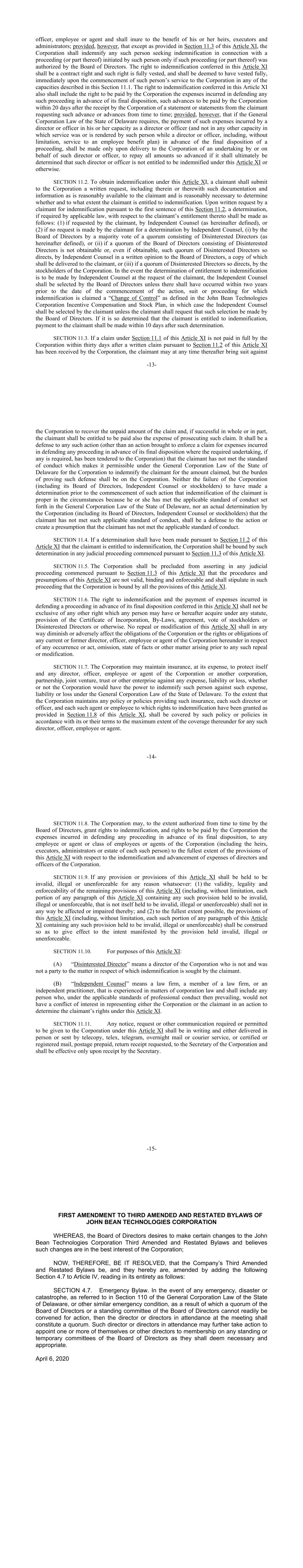 -13- officer, employee or agent and shall inure to the benefit of his or her heirs, executors and administrators; provided, however, that except as provided in Section 11.3 of this Article XI, the Corporation shall indemnify any such person seeking indemnification in connection with a proceeding (or part thereof) initiated by such person only if such proceeding (or part thereof) was authorized by the Board of Directors. The right to indemnification conferred in this Article XI shall be a contract right and such right is fully vested, and shall be deemed to have vested fully, immediately upon the commencement of such person’s service to the Corporation in any of the capacities described in this Section 11.1. The right to indemnification conferred in this Article XI also shall include the right to be paid by the Corporation the expenses incurred in defending any such proceeding in advance of its final disposition, such advances to be paid by the Corporation within 20 days after the receipt by the Corporation of a statement or statements from the claimant requesting such advance or advances from time to time; provided, however, that if the General Corporation Law of the State of Delaware requires, the payment of such expenses incurred by a director or officer in his or her capacity as a director or officer (and not in any other capacity in which service was or is rendered by such person while a director or officer, including, without limitation, service to an employee benefit plan) in advance of the final disposition of a proceeding, shall be made only upon delivery to the Corporation of an undertaking by or on behalf of such director or officer, to repay all amounts so advanced if it shall ultimately be determined that such director or officer is not entitled to be indemnified under this Article XI or otherwise. SECTION 11.2. To obtain indemnification under this Article XI, a claimant shall submit to the Corporation a written request, including therein or therewith such documentation and information as is reasonably available to the claimant and is reasonably necessary to determine whether and to what extent the claimant is entitled to indemnification. Upon written request by a claimant for indemnification pursuant to the first sentence of this Section 11.2, a determination, if required by applicable law, with respect to the claimant’s entitlement thereto shall be made as follows: (1) if requested by the claimant, by Independent Counsel (as hereinafter defined), or (2) if no request is made by the claimant for a determination by Independent Counsel, (i) by the Board of Directors by a majority vote of a quorum consisting of Disinterested Directors (as hereinafter defined), or (ii) if a quorum of the Board of Directors consisting of Disinterested Directors is not obtainable or, even if obtainable, such quorum of Disinterested Directors so directs, by Independent Counsel in a written opinion to the Board of Directors, a copy of which shall be delivered to the claimant, or (iii) if a quorum of Disinterested Directors so directs, by the stockholders of the Corporation. In the event the determination of entitlement to indemnification is to be made by Independent Counsel at the request of the claimant, the Independent Counsel shall be selected by the Board of Directors unless there shall have occurred within two years prior to the date of the commencement of the action, suit or proceeding for which indemnification is claimed a “Change of Control” as defined in the John Bean Technologies Corporation Incentive Compensation and Stock Plan, in which case the Independent Counsel shall be selected by the claimant unless the claimant shall request that such selection be made by the Board of Directors. If it is so determined that the claimant is entitled to indemnification, payment to the claimant shall be made within 10 days after such determination. SECTION 11.3. If a claim under Section 11.1 of this Article XI is not paid in full by the Corporation within thirty days after a written claim pursuant to Section 11.2 of this Article XI has been received by the Corporation, the claimant may at any time thereafter bring suit against -14- the Corporation to recover the unpaid amount of the claim and, if successful in whole or in part, the claimant shall be entitled to be paid also the expense of prosecuting such claim. It shall be a defense to any such action (other than an action brought to enforce a claim for expenses incurred in defending any proceeding in advance of its final disposition where the required undertaking, if any is required, has been tendered to the Corporation) that the claimant has not met the standard of conduct which makes it permissible under the General Corporation Law of the State of Delaware for the Corporation to indemnify the claimant for the amount claimed, but the burden of proving such defense shall be on the Corporation. Neither the failure of the Corporation (including its Board of Directors, Independent Counsel or stockholders) to have made a determination prior to the commencement of such action that indemnification of the claimant is proper in the circumstances because he or she has met the applicable standard of conduct set forth in the General Corporation Law of the State of Delaware, nor an actual determination by the Corporation (including its Board of Directors, Independent Counsel or stockholders) that the claimant has not met such applicable standard of conduct, shall be a defense to the action or create a presumption that the claimant has not met the applicable standard of conduct. SECTION 11.4. If a determination shall have been made pursuant to Section 11.2 of this Article XI that the claimant is entitled to indemnification, the Corporation shall be bound by such determination in any judicial proceeding commenced pursuant to Section 11.3 of this Article XI. SECTION 11.5. The Corporation shall be precluded from asserting in any judicial proceeding commence