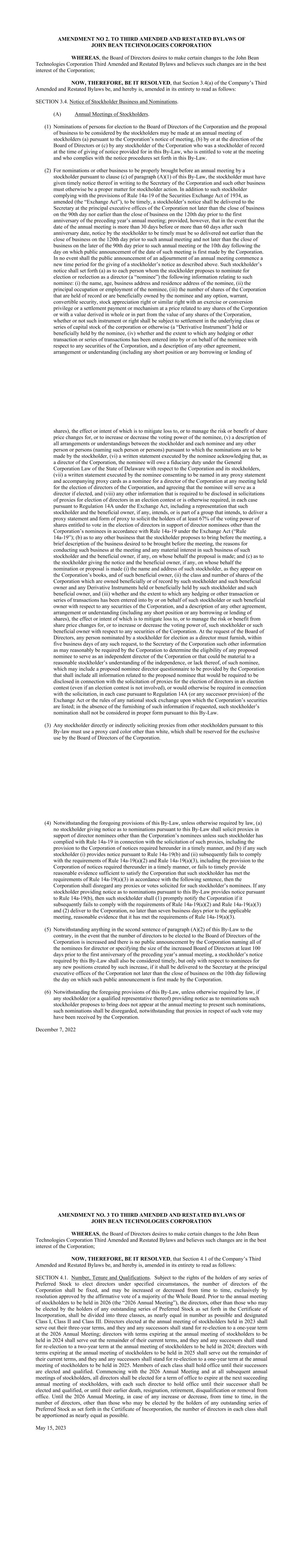 AMENDMENT NO 2. TO THIRD AMENDED AND RESTATED BYLAWS OF JOHN BEAN TECHNOLOGIES CORPORATION WHEREAS, the Board of Directors desires to make certain changes to the John Bean Technologies Corporation Third Amended and Restated Bylaws and believes such changes are in the best interest of the Corporation; NOW, THEREFORE, BE IT RESOLVED, that Section 3.4(a) of the Company’s Third Amended and Restated Bylaws be, and hereby is, amended in its entirety to read as follows: SECTION 3.4. Notice of Stockholder Business and Nominations. (A) Annual Meetings of Stockholders. (1) Nominations of persons for election to the Board of Directors of the Corporation and the proposal of business to be considered by the stockholders may be made at an annual meeting of stockholders (a) pursuant to the Corporation’s notice of meeting, (b) by or at the direction of the Board of Directors or (c) by any stockholder of the Corporation who was a stockholder of record at the time of giving of notice provided for in this By-Law, who is entitled to vote at the meeting and who complies with the notice procedures set forth in this By-Law. (2) For nominations or other business to be properly brought before an annual meeting by a stockholder pursuant to clause (c) of paragraph (A)(1) of this By-Law, the stockholder must have given timely notice thereof in writing to the Secretary of the Corporation and such other business must otherwise be a proper matter for stockholder action. In addition to such stockholder complying with the provisions of Rule 14a-19 of the Securities Exchange Act of 1934, as amended (the “Exchange Act”), to be timely, a stockholder’s notice shall be delivered to the Secretary at the principal executive offices of the Corporation not later than the close of business on the 90th day nor earlier than the close of business on the 120th day prior to the first anniversary of the preceding year’s annual meeting; provided, however, that in the event that the date of the annual meeting is more than 30 days before or more than 60 days after such anniversary date, notice by the stockholder to be timely must be so delivered not earlier than the close of business on the 120th day prior to such annual meeting and not later than the close of business on the later of the 90th day prior to such annual meeting or the 10th day following the day on which public announcement of the date of such meeting is first made by the Corporation. In no event shall the public announcement of an adjournment of an annual meeting commence a new time period for the giving of a stockholder’s notice as described above. Such stockholder’s notice shall set forth (a) as to each person whom the stockholder proposes to nominate for election or reelection as a director (a “nominee”) the following information relating to such nominee: (i) the name, age, business address and residence address of the nominee, (ii) the principal occupation or employment of the nominee, (iii) the number of shares of the Corporation that are held of record or are beneficially owned by the nominee and any option, warrant, convertible security, stock appreciation right or similar right with an exercise or conversion privilege or a settlement payment or mechanism at a price related to any shares of the Corporation or with a value derived in whole or in part from the value of any shares of the Corporation, whether or not such instrument or right shall be subject to settlement in the underlying class or series of capital stock of the corporation or otherwise (a “Derivative Instrument”) held or beneficially held by the nominee, (iv) whether and the extent to which any hedging or other transaction or series of transactions has been entered into by or on behalf of the nominee with respect to any securities of the Corporation, and a description of any other agreement, arrangement or understanding (including any short position or any borrowing or lending of shares), the effect or intent of which is to mitigate loss to, or to manage the risk or benefit of share price changes for, or to increase or decrease the voting power of the nominee, (v) a description of all arrangements or understandings between the stockholder and each nominee and any other person or persons (naming such person or persons) pursuant to which the nominations are to be made by the stockholder, (vi) a written statement executed by the nominee acknowledging that, as a director of the Corporation, the nominee will owe a fiduciary duty under the General Corporation Law of the State of Delaware with respect to the Corporation and its stockholders, (vii) a written statement executed by the nominee consenting to be named in any proxy statement and accompanying proxy cards as a nominee for a director of the Corporation at any meeting held for the election of directors of the Corporation, and agreeing that the nominee will serve as a director if elected, and (viii) any other information that is required to be disclosed in solicitations of proxies for election of directors in an election contest or is otherwise required, in each case pursuant to Regulation 14A under the Exchange Act, including a representation that such stockholder and the beneficial owner, if any, intends, or is part of a group that intends, to deliver a proxy statement and form of proxy to solicit the holders of at least 67% of the voting power of shares entitled to vote in the election of directors in support of director nominees other than the Corporation’s nominees in accordance with Rule 14a-19 under the Exchange Act (“Rule 14a-19”); (b) as to any other business that the stockholder proposes to bring before the meeting, a brief description of the business desired to be brought before the meeting, the reasons for conducting such business at the meeting and any material interest in such business of such stockholder and the beneficial owner, if any, on whose behalf the proposal is made; and (c) as to the stockholder giving