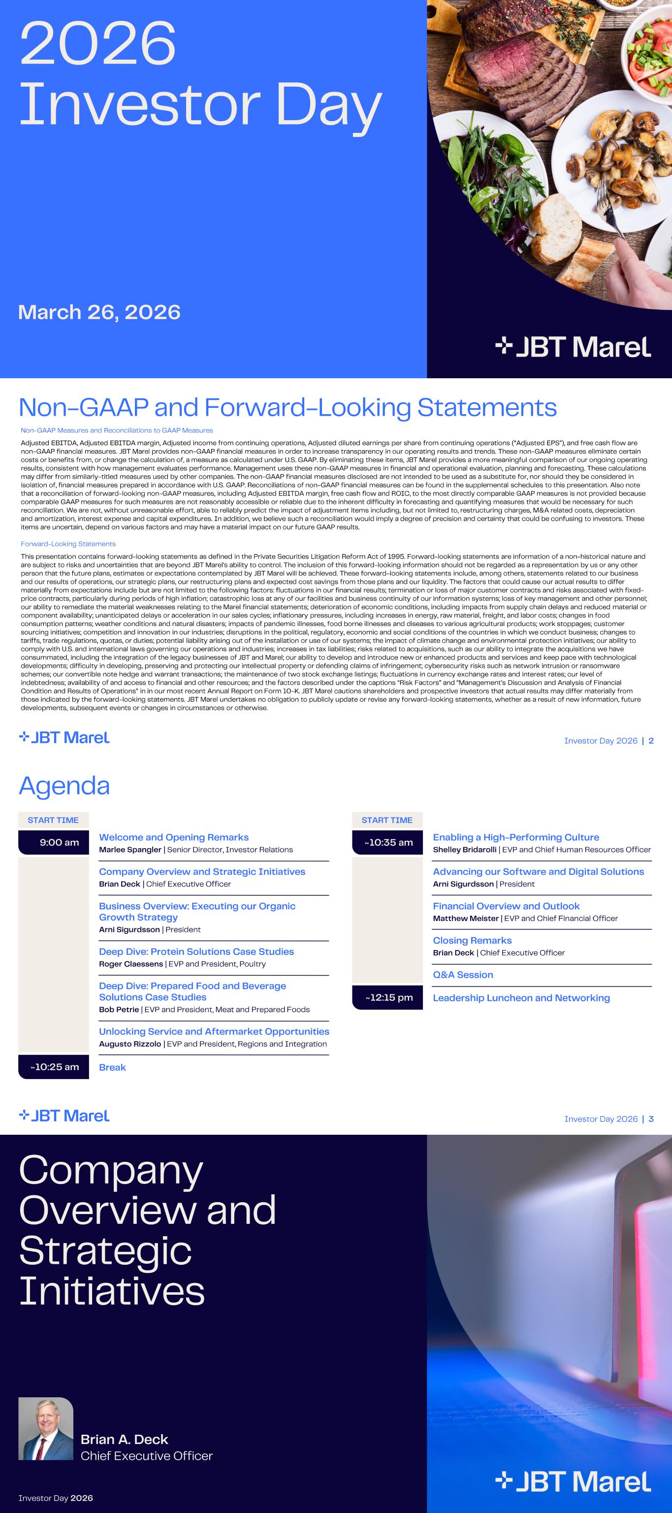 2026 Investor Day March 26, 2026 Investor Day 2026 | 2 Non - GAAP and Forward - Looking Statements Non - GAAP Measures and Reconciliations to GAAP Measures Adjusted EBITDA, Adjusted EBITDA margin, Adjusted income from continuing operations, Adjusted diluted earnings per share from co ntinuing operations (“Adjusted EPS”), and free cash flow are non - GAAP financial measures. JBT Marel provides non - GAAP financial measures in order to increase transparency in our operating r esults and trends. These non - GAAP measures eliminate certain costs or benefits from, or change the calculation of, a measure as calculated under U.S. GAAP. By eliminating these items, JB T M arel provides a more meaningful comparison of our ongoing operating results, consistent with how management evaluates performance. Management uses these non - GAAP measures in financial and operatio nal evaluation, planning and forecasting. These calculations may differ from similarly - titled measures used by other companies. The non - GAAP financial measures disclosed are not intended to be used as a substitute for, nor should they be considered in isolation of, financial measures prepared in accordance with U.S. GAAP. Reconciliations of non - GAAP financial measures can be fo und in the supplemental schedules to this presentation. Also note that a reconciliation of forward - looking non - GAAP measures, including Adjusted EBITDA margin, free cash flow and ROIC, to the mo st directly comparable GAAP measures is not provided because comparable GAAP measures for such measures are not reasonably accessible or reliable due to the inherent difficulty in foreca sti ng and quantifying measures that would be necessary for such reconciliation. We are not, without unreasonable effort, able to reliably predict the impact of adjustment items including, b ut not limited to, restructuring charges, M&A related costs, depreciation and amortization, interest expense and capital expenditures. In addition, we believe such a reconciliation would imply a degr ee of precision and certainty that could be confusing to investors. These items are uncertain, depend on various factors and may have a material impact on our future GAAP results. Forward - Looking Statements This presentation contains forward - looking statements as defined in the Private Securities Litigation Reform Act of 1995. Forwar d- looking statements are information of a non - historical nature and are subject to risks and uncertainties that are beyond JBT Marel's ability to control. The inclusion of this forward - looking inf ormation should not be regarded as a representation by us or any other person that the future plans, estimates or expectations contemplated by JBT Marel will be achieved. These forward - looking statem ents include, among others, statements related to our business and our results of operations, our strategic plans, our restructuring plans and expected cost savings from those plans and ou r liquidity. The factors that could cause our actual results to differ materially from expectations include but are not limited to the following factors: fluctuations in our financial results; ter min ation or loss of major customer contracts and risks associated with fixed - price contracts, particularly during periods of high inflation; catastrophic loss at any of our facilities and business conti nuity of our information systems; loss of key management and other personnel; our ability to remediate the material weaknesses relating to the Marel financial statements; deterioration of economic condit ions, including impacts from supply chain delays and reduced material or component availability; unanticipated delays or acceleration in our sales cycles; inflationary pressures, including increases in energy, raw material, freight, and labor costs; changes in food consumption patterns; weather conditions and natural disasters; impacts of pandemic illnesses, food borne illnesses and disea ses to various agricultural products; work stoppages; customer sourcing initiatives; competition and innovation in our industries; disruptions in the political, regulatory, economic and so cia l conditions of the countries in which we conduct business; changes to tariffs, trade regulations, quotas, or duties; potential liability arising out of the installation or use of our systems; the impact of climate change and environmental protection initiatives; our ability to comply with U.S. and international laws governing our operations and industries; increases in tax liabilities; risks related to acquisitions, such as our ability to integrate the acquisitions we have consummated, including the integration of the legacy businesses of JBT and Marel; our ability to develop and introduce new or enhanced products and services and keep pace with technological developments; difficulty in developing, preserving and protecting our intellectual property or defending claims of infringeme nt; cybersecurity risks such as network intrusion or ransomware schemes; our convertible note hedge and warrant transactions; the maintenance of two stock exchange listings; fluctuations in cu rrency exchange rates and interest rates; our level of indebtedness; availability of and access to financial and other resources; and the factors described under the captions “Risk Fa ctors” and “Management’s Discussion and Analysis of Financial Condition and Results of Operations” in in our most recent Annual Report on Form 10 - K. JBT Marel cautions shareholders and prosp ective investors that actual results may differ materially from those indicated by the forward - looking statements. JBT Marel undertakes no obligation to publicly update or revise any forward - looking statements, whether as a result of new information, future developments, subsequent events or changes in circumstances or otherwise . Investor Day 2026 | 3 Agenda Enabling a High - Performing Culture Shelley Bridarolli | EVP and Chief Human Resources Officer