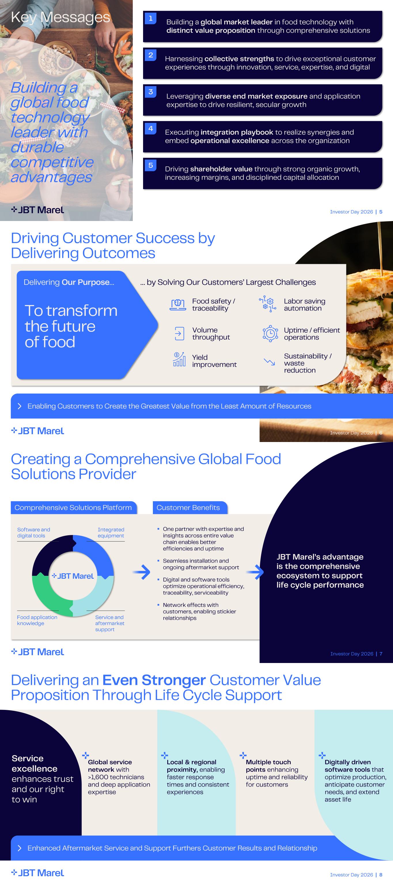 Investor Day 2026 | 5 Key Messages 1 2 3 4 5 Leveraging diverse end market exposure and application expertise to drive resilient, secular growth Building a global market leader in food technology with distinct value proposition through comprehensive solutions Harnessing collective strengths to drive exceptional customer experiences through innovation, service, expertise, and digital Executing integration playbook to realize synergies and embed operational excellence across the organization Driving shareholder value through strong organic growth, increasing margins, and disciplined capital allocation Building a global food technology leader with durable competitive advantages Investor Day 2026 | 6 Driving Customer Success by Delivering Outcomes Enabling Customers to Create the Greatest Value from the Least Amount of Resources To transform the future of food Food safety / traceability Labor saving automation Delivering Our Purpose … Volume throughput Uptime / efficient operations Yield improvement Sustainability / waste reduction … by Solving Our Customers’ Largest Challenges Investor Day 2026 | 7 Customer BenefitsComprehensive Solutions Platform Creating a Comprehensive Global Food Solutions Provider ▪ One partner with expertise and insights across entire value chain enables better efficiencies and uptime ▪ Seamless installation and ongoing aftermarket support ▪ Digital and software tools optimize operational efficiency, traceability, serviceability ▪ Network effects with customers, enabling stickier relationships JBT Marel’s advantage is the comprehensive ecosystem to support life cycle performance Integrated equipment Food application knowledge Software and digital tools Service and aftermarket support Investor Day 2026 | 8 Service excellence enhances trust and our right to win Delivering an Even Stronger Customer Value Proposition Through Life Cycle Support Enhanced Aftermarket Service and Support Furthers Customer Results and Relationship Global service network with >1,600 technicians and deep application expertise Local & regional proximity, enabling faster response times and consistent experiences Multiple touch points enhancing uptime and reliability for customers Digitally driven software tools that optimize production, anticipate customer needs, and extend asset life