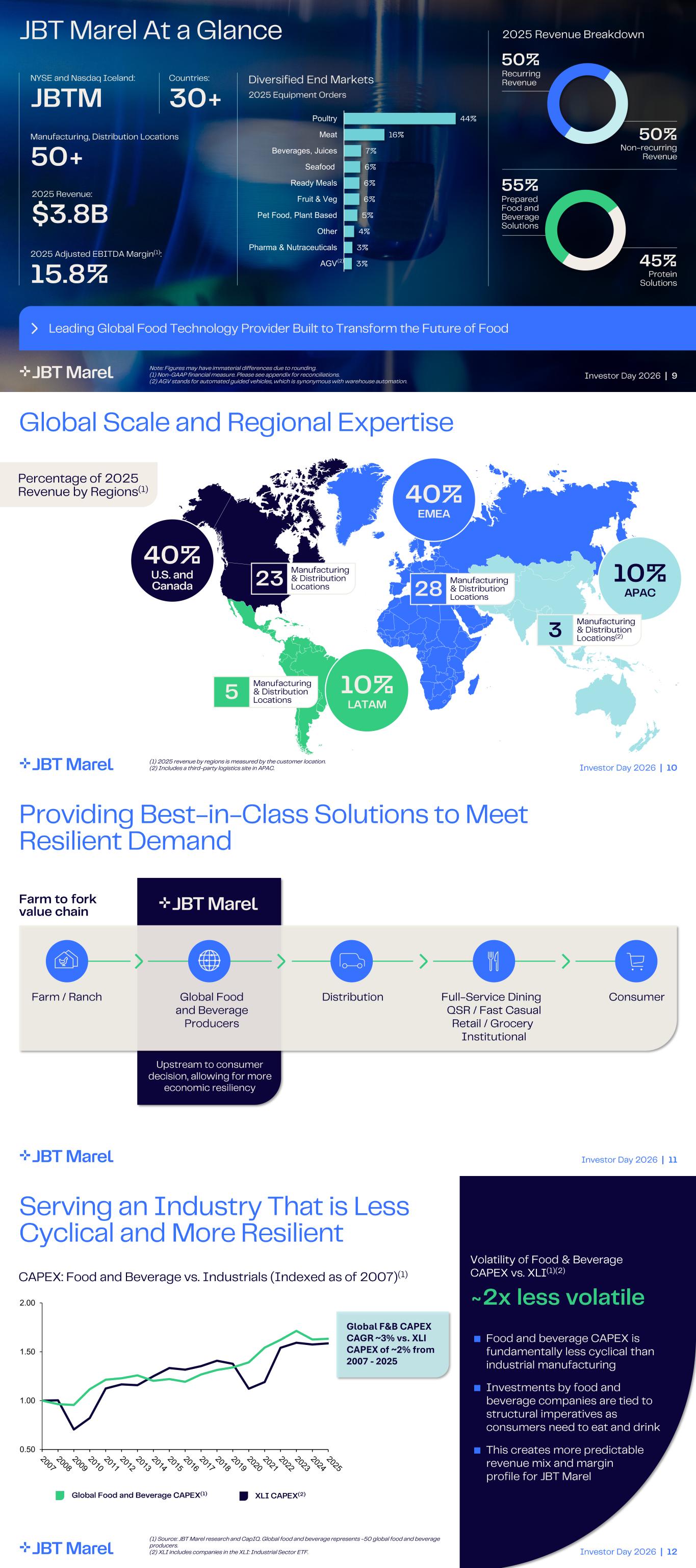 Investor Day 2026 | 9 JBT Marel At a Glance Leading Global Food Technology Provider Built to Transform the Future of Food NYSE and Nasdaq Iceland: JBTM Countries: 30+ Manufacturing, Distribution Locations 50+ 2025 Revenue: $3.8B 2025 Adjusted EBITDA Margin (1): 15.8% Diversified End Markets 2025 Equipment Orders 2025 Revenue Breakdown (2) 44% 16% 7% 6% 6% 6% 5% 4% 3% 3% Poultry Meat Beverages, Juices Seafood Ready Meals Fruit & Veg Pet Food, Plant Based Other Pharma & Nutraceuticals AGV Note: Figures may have immaterial differences due to rounding. (1) Non-GAAP financial measure. Please see appendix for reconciliations. (2) AGV stands for automated guided vehicles, which is synonymous with warehouse automation. 50% Recurring Revenue 50% Non - recurring Revenue 45% Protein Solutions 55% Prepared Food and Beverage Solutions … … … Investor Day 2026 | 10 Global Scale and Regional Expertise Percentage of 2025 Revenue by Regions (1) 10% LATAM 40% EMEA 10% APAC 40% U.S. and Canada Manufacturing & Distribution Locations23 Manufacturing & Distribution Locations5 Manufacturing & Distribution Locations28 Manufacturing & Distribution Locations (2)3 (1) 2025 revenue by regions is measured by the customer location. (2) Includes a third-party logistics site in APAC. Investor Day 2026 | 11 Providing Best - in- Class Solutions to Meet Resilient Demand Farm to fork value chain Gl obal Food and Beverage Producers Full - Service Dining QSR / Fast Casual Retail / Grocery Institutional Distribution ConsumerFarm / Ranch Upstream to consumer de c ision , allowing for more economic resiliency Investor Day 2026 | 12 Serving an Industry That is Less Cyclical and More Resilient ■ Food and beverage CAPEX is fundamentally less cyclical than industrial manufacturing ■ Investments by food and beverage companies are tied to structural imperatives as consumers need to eat and drink ■ This creates more predictable revenue mix and margin profile for JBT Marel CAPEX: Food and Beverage vs. Industrials (Indexed as of 2007) (1) Global Food and Beverage CAPEX (1) XLI CAPEX (2) ~2x less volatile Volatility of Food & Beverage CAPEX vs. XLI (1)(2) (1) Source: JBT Marel research and CapIQ. Global food and beverage represents ~50 global food and beverage producers. (2) XLI includes companies in the XLI: Industrial Sector ETF. 0.50 1.00 1.50 2.00 Global F&B CAPEX CAGR ~3% vs. XLI CAPEX of ~2% from 2007 - 2025