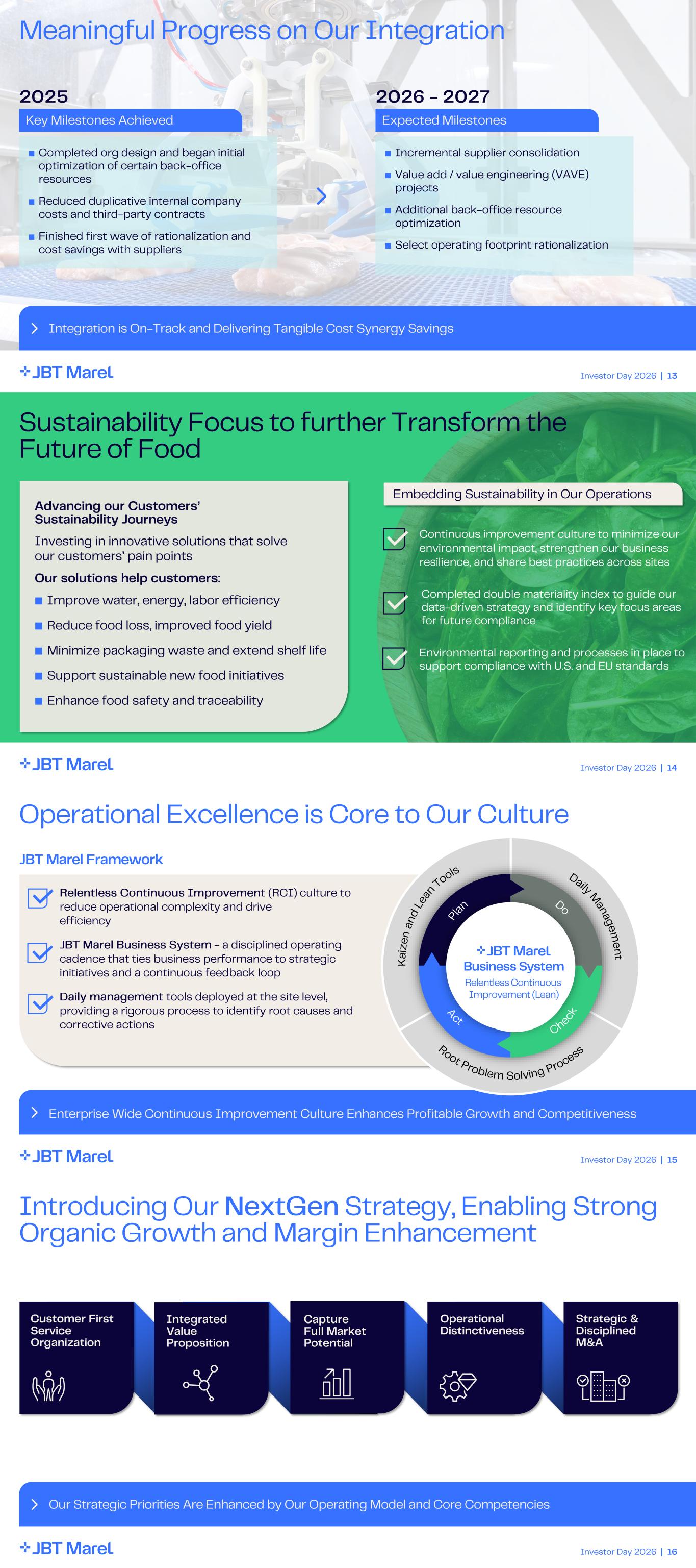 Investor Day 2026 | 13 Meaningful Progress on Our Integration Integration is On - Track and Delivering Tangible Cost Synergy Savings ■ Completed org design and began initial optimization of certain back - office resources ■ Reduced duplicative internal company costs and third - party contracts ■ Finished first wave of rationalization and cost savings with suppliers 2025 2026 - 2027 ■ Incremental supplier consolidation ■ Value add / value engineering (VAVE) projects ■ Additional back - office resource optimization ■ Select operating footprint rationalization Key Milestones Achieved Expected Milestones Investor Day 2026 | 14 Sustainability Focus to further Transform the Future of Food Advancing our Customers’ Sustainability Journeys Investing in innovative solutions that solve our customers’ pain points Our solutions help customers: ■ Improve water, energy, labor efficiency ■ Reduce food loss, improved food yield ■ Minimize packaging waste and extend shelf life ■ Support sustainable new food initiatives ■ Enhance food safety and traceability Completed double materiality index to guide our data - driven strategy and identify key focus areas for future compliance Environmental reporting and processes in place to support compliance with U.S. and EU standards Continuous improvement culture to minimize our environmental impact, strengthen our business resilience, and share best practices across sites Embedding Sustainability in Our Operations Investor Day 2026 | 15 Operational Excellence is Core to Our Culture Enterprise Wide Continuous Improvement Culture Enhances Profitable Growth and Competitiveness Daily M an a g e m e n t K a iz e n a n d Le an Tools Root Problem Solving Pro cess Chec kA ct P la n Business System + Relentless Continuous Improvement (Lean) D o JBT Marel Framework Relentless Continuous Improvement (RCI) culture to reduce operational complexity and drive efficiency JBT Marel Business System - a disciplined operating cadence that ties business performance to strategic initiatives and a continuous feedback loop Daily management tools deployed at the site level, providing a rigorous process to identify root causes and corrective actions Busi s System Relentless Continuous Improvement (Lean) Investor Day 2026 | 16 Introducing Our NextGen Strategy, Enabling Strong Organic Growth and Margin Enhancement Our Strategic Priorities Are Enhanced by Our Operating Model and Core Competencies Customer First Service Organization Capture Full Market Potential Integrated Value Proposition Operational Distinctiveness Strategic & Disciplined M&A