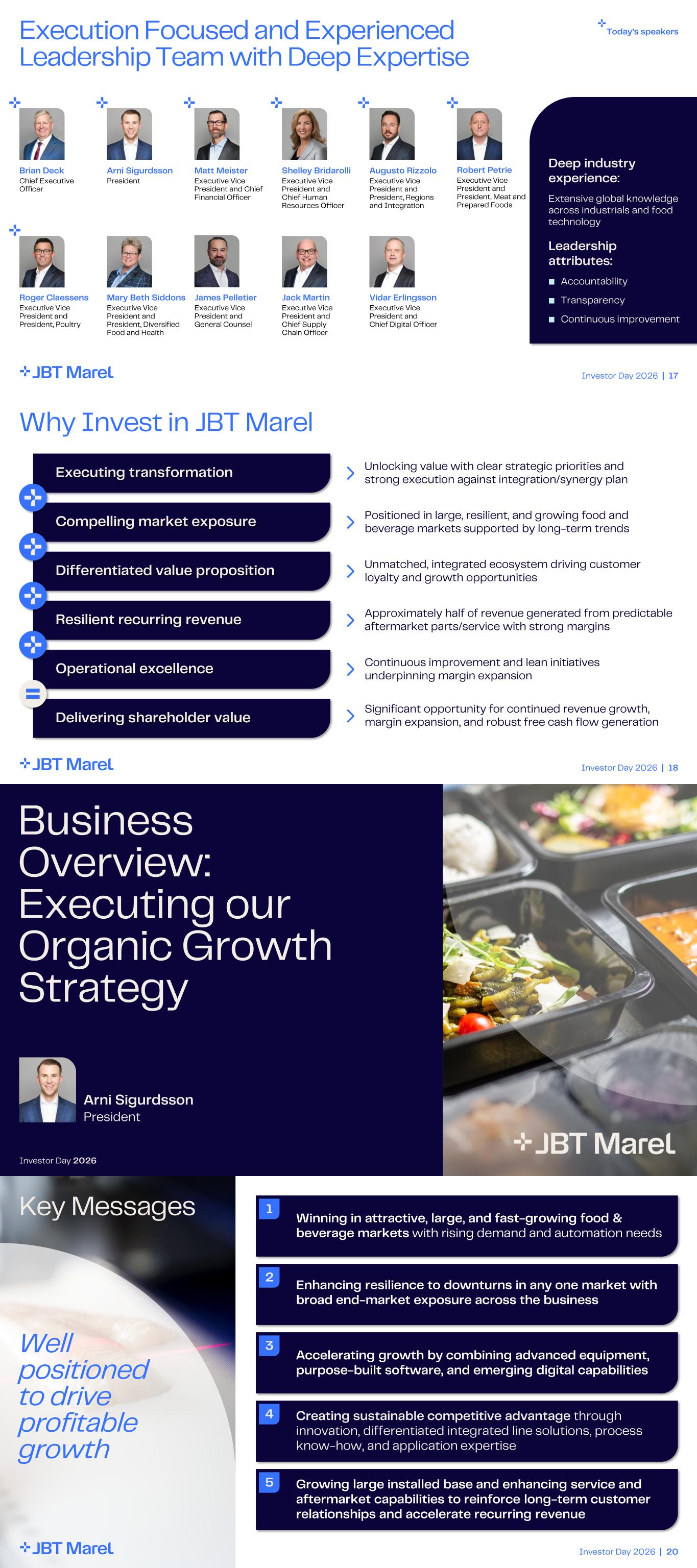 Investor Day 2026 | 17 Execution Focused and Experienced Leadership Team with Deep Expertise Brian Deck Chief Executive Officer Arni Sigurdsson President Matt Meister Executive Vice President and Chief Financial Officer Shelley Bridarolli Executive Vice President and Chief Human Resources Officer James Pelletier Executive Vice President and General Counsel Jack Martin Executive Vice President and Chief Supply Chain Officer Mary Beth Siddons Executive Vice President and President, Diversified Food and Health Deep industry experience: Extensive global knowledge across industrials and food technology Leadership attributes: ■ Accountability ■ Transparency ■ Continuous improvement Today’s speakers Augusto Rizzolo Executive Vice President and President, Regions and Integration Roger Claessens Executive Vice President and President, Poultry Robert Petrie Executive Vice President and President, Meat and Prepared Foods Vidar Erlingsson Executive Vice President and Chief Digital Officer Investor Day 2026 | 18 Executing transformation Compelling market exposure Resilient recurring revenue Operational excellence Delivering shareholder value Differentiated value proposition Why Invest in JBT Marel Approximately half of revenue generated from predictable aftermarket parts/service with strong margins Positioned in large, resilient, and growing food and beverage markets supported by long - term trends Continuous improvement and lean initiatives underpinning margin expansion Significant opportunity for continued revenue growth, margin expansion, and robust free cash flow generation Unlocking value with clear strategic priorities and strong execution against integration/synergy plan Unmatched, integrated ecosystem driving customer loyalty and growth opportunities Arni Sigurdsson President Business Overview: Executing our Organic Growth Strategy Investor Day 2026 Investor Day 2026 | 20 Key Messages 2 1 Winning in attractive, large, and fast - growing food & beverage markets with rising demand and automation needs 3 Enhancing resilience to downturns in any one market with broad end - market exposure across the business 4 Accelerating growth by combining advanced equipment, purpose - built software, and emerging digital capabilities 5 Growing large installed base and enhancing service and aftermarket capabilities to reinforce long - term customer relationships and accelerate recurring revenue Well positioned to drive profitable growth Creating sustainable competitive advantage through innovation, differentiated integrated line solutions, process know - how, and application expertise