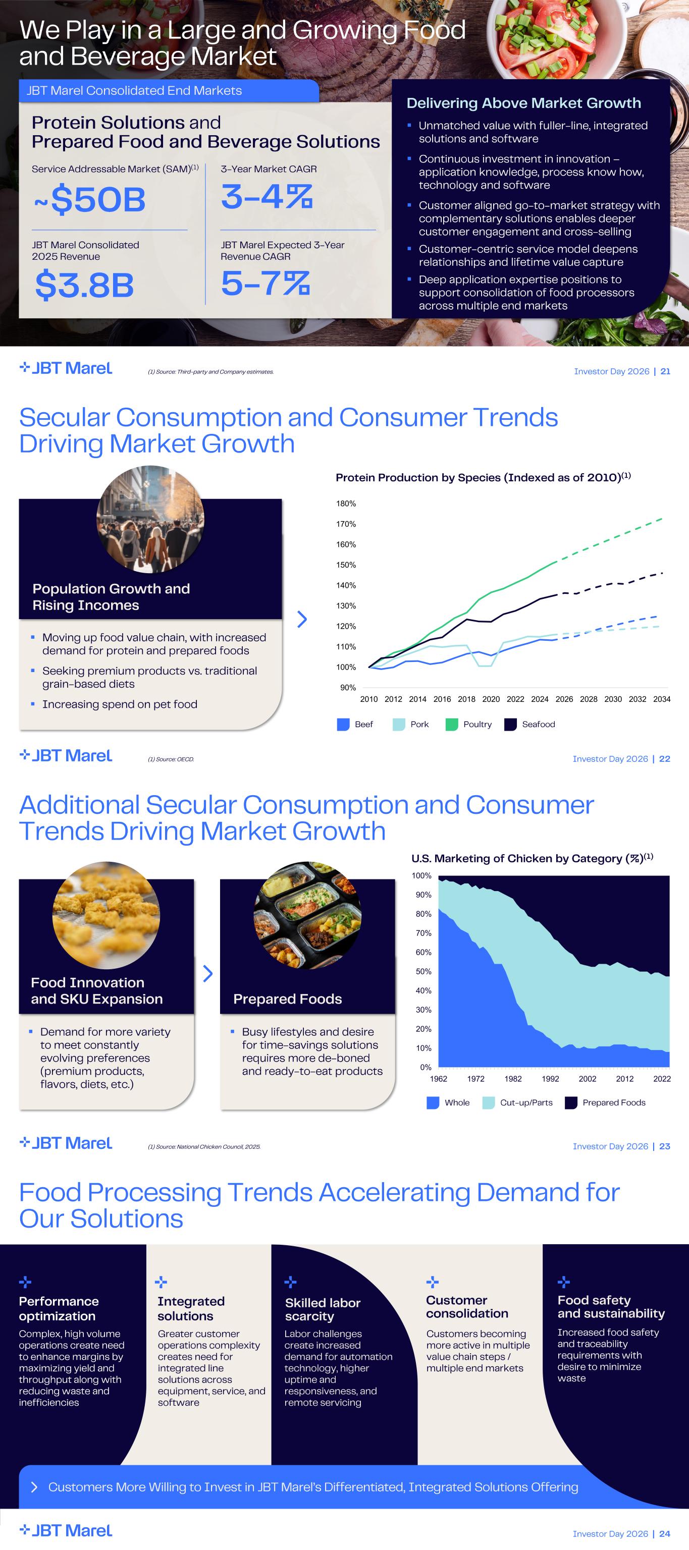 Investor Day 2026 | 21 We Play in a Large and Growing Food and Beverage Market Protein Solutions and Prepared Food and Beverage Solutions Delivering Above Market Growth ▪ Unmatched value with fuller - line, integrated solutions and software ▪ Continuous investment in innovation – application knowledge, process know how, technology and software ▪ Customer aligned go - to- market strategy with complementary solutions enables deeper customer engagement and cross - selling ▪ Customer - centric service model deepens relationships and lifetime value capture ▪ Deep application expertise positions to support consolidation of food processors across multiple end markets JBT Marel Consolidated End Markets JBT Marel Consolidated 2025 Revenue 5 - 7% 3 - Year Market CAGR 3 - 4% JBT Marel Expected 3 - Year Revenue CAGR $3.8B Service Addressable Market (SAM) (1) ~$50B (1) Source: Third-party and Company estimates. Investor Day 2026 | 22 Secular Consumption and Consumer Trends Driving Market Growth Population Growth and Rising Incomes ▪ Moving up food value chain, with increased demand for protein and prepared foods ▪ Seeking premium products vs. traditional grain - based diets ▪ Increasing spend on pet food 90% 100% 110% 120% 130% 140% 150% 160% 170% 180% 2010 2012 2014 2016 2018 2020 2022 2024 2026 2028 2030 2032 2034 Protein Production by Species (Indexed as of 2010) (1) Beef Pork Poultry Seafood (1) Source: OECD. Investor Day 2026 | 23 Additional Secular Consumption and Consumer Trends Driving Market Growth Food Innovation and SKU Expansion ▪ Demand for more variety to meet constantly evolving preferences (premium products, flavors , diets, etc.) Prepared Foods ▪ Busy lifestyles and desire for time - savings solutions requires more de - boned and ready - to- eat products 0% 10% 20% 30% 40% 50% 60% 70% 80% 90% 100% 1962 1972 1982 1992 2002 2012 2022 U.S. Marketing of Chicken by Category (%) (1) Whole Cut - up/Parts Prepared Foods (1) Source: National Chicken Council, 2025. Investor Day 2026 | 24 Labor challenges create increased demand for automation technology, higher uptime and responsiveness, and remote servicing Performance optimization Skilled labor scarcity Customer consolidation Customers becoming more active in multiple value chain steps / multiple end markets Customers More Willing to Invest in JBT Marel’s Differentiated, Integrated Solutions Offering Food safety and sustainability Food Processing Trends Accelerating Demand for Our Solutions Increased food safety traceability requirements and desire to minimize waste and improve sustainability metrics I r s f s f t and traceability requirem nts with desir to minimize waste Integrated solutions Greater customer operations complexity creates need for integrated line solutions across equipment, service, and software Complex, high volume operations create need to enhance margins by maximizing yield and throughput along with reducing waste and inefficiencies