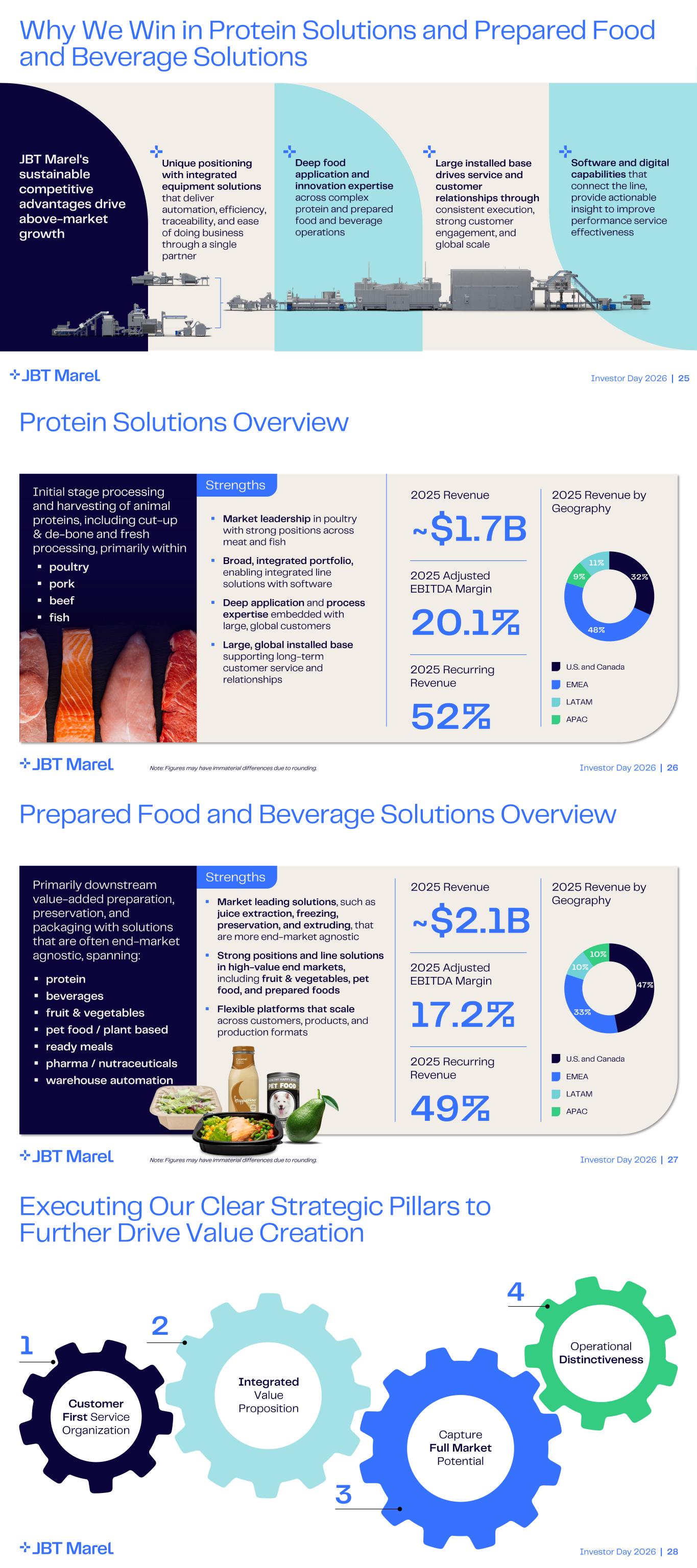 Investor Day 2026 | 25 Unique positioning with integrated equipment solutions that deliver automation, efficiency, traceability, and ease of doing business through a single partner JBT Marel's sustainable competitive advantages drive above - market growth Deep food application and innovation expertise across complex protein and prepared food and beverage operations Large installed base drives service and customer relationships through consistent execution, strong customer engagement, and global scale Software and digital capabilities that connect the line, provide actionable insight to improve performance service effectiveness Why We Win in Protein Solutions and Prepared Food and Beverage Solutions Investor Day 2026 | 25 Investor Day 2026 | 26 Protein Solutions Overview 2025 Recurring Revenue 52% 2025 Adjusted EBITDA Margin 20.1% 2025 Revenue by Geography U.S. and Canada EMEA LATAM APAC ~$1.7B 2025 Revenue Strengths ▪ Market leadership in poultry with strong positions across meat and fish ▪ Broad, integrated portfolio, enabling integrated line solutions with software ▪ Deep application and process expertise embedded with large, global customers ▪ Large, global installed base supporting long - term customer service and relationships Initial stage processing and harvesting of animal proteins, including cut - up & de - bone and fresh processing , primarily within ▪ poultry ▪ pork ▪ beef ▪ fish 32% 48% 9% 11% Note: Figures may have immaterial differences due to rounding. Investor Day 2026 | 27 Prepared Food and Beverage Solutions Overview 2025 Recurring Revenue 49% 2025 Adjusted EBITDA Margin 17.2% 2025 Revenue by Geography U.S. and Canada EMEA LATAM APAC ~$2.1B 2025 RevenuePrimarily downstream value - added preparation, preservation, and packaging with solutions that are often end - market agnostic, spanning: ▪ Market leading solutions , such as juice extraction, freezing , preservation, and extruding , that are more end - market agnostic ▪ Strong positions and line solutions in high - value end markets, including fruit & vegetables, pet food, and prepared foods ▪ Flexible platforms that scale across customers, products, and production formats ▪ protein ▪ beverages ▪ fruit & vegetables ▪ pet food / plant based ▪ ready meals ▪ pharma / nutraceuticals ▪ warehouse automation 47% 33% 10% 10% Strengths Note: Figures may have immaterial differences due to rounding. Investor Day 2026 | 28 Executing Our Clear Strategic Pillars to Further Drive Value Creation Customer First Service Organization Capture Full Market Potential Integrated Value Proposition Operational Distinctiveness 1 2 4 3