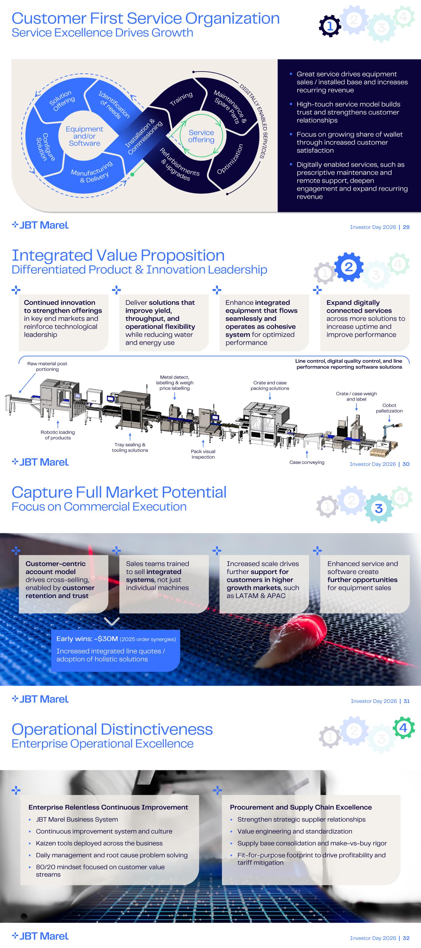 Investor Day 2026 | 29 Customer First Service Organization Service Excellence Drives Growth ▪ Great service drives equipment sales / installed base and increases recurring revenue ▪ High - touch service model builds trust and strengthens customer relationships ▪ Focus on growing share of wallet through increased customer satisfaction ▪ Digitally enabled services, such as prescriptive maintenance and remote support, deepen engagement and expand recurring revenue 1 2 3 4 Investor Day 2026 | 30 Integrated Value Proposition Differentiated Product & Innovation Leadership Continued innovation to strengthen offerings in key end markets and reinforce technological leadership Deliver solutions that improve yield, throughput, and operational flexibility while reducing water and energy use Expand digitally connected services across more solutions to increase uptime and improve performance Enhance integrated equipment that flows seamlessly and operates as cohesive system for optimized performance Robotic loading of products Raw material post portioning Tray sealing & tooling solutions Pack visual inspection Case conveying Metal detect, labelling & weigh price labelling Crate and case packing solutions Crate / case weigh and label Cobot palletization Line control, digital quality control, and line performance reporting software solutions 1 2 3 4 Investor Day 2026 | 31 Capture Full Market Potential Focus on Commercial Execution Customer - centric account model drives cross - selling, enabled by customer retention and trust Sales teams trained to sell integrated systems , not just individual machines Early wins: ~$30M (2025 order synergies) Increased integrated line quotes / adoption of holistic solutions Enhanced service and software create further opportunities for equipment sales Increased scale drives further support for customers in higher growth markets , such as LATAM & APAC 1 2 3 4 Investor Day 2026 | 32 Operational Distinctiveness Enterprise Operational Excellence 1 2 3 4 Enterprise Relentless Continuous Improvement ▪ JBT Marel Business System ▪ Continuous improvement system and culture ▪ Kaizen tools deployed across the business ▪ Daily management and root cause problem solving ▪ 80/20 mindset focused on customer value streams Procurement and Supply Chain Excellence ▪ Strengthen strategic supplier relationships ▪ Value engineering and standardization ▪ Supply base consolidation and make - vs - buy rigor ▪ Fit - for - purpose footprint to drive profitability and tariff mitigation
