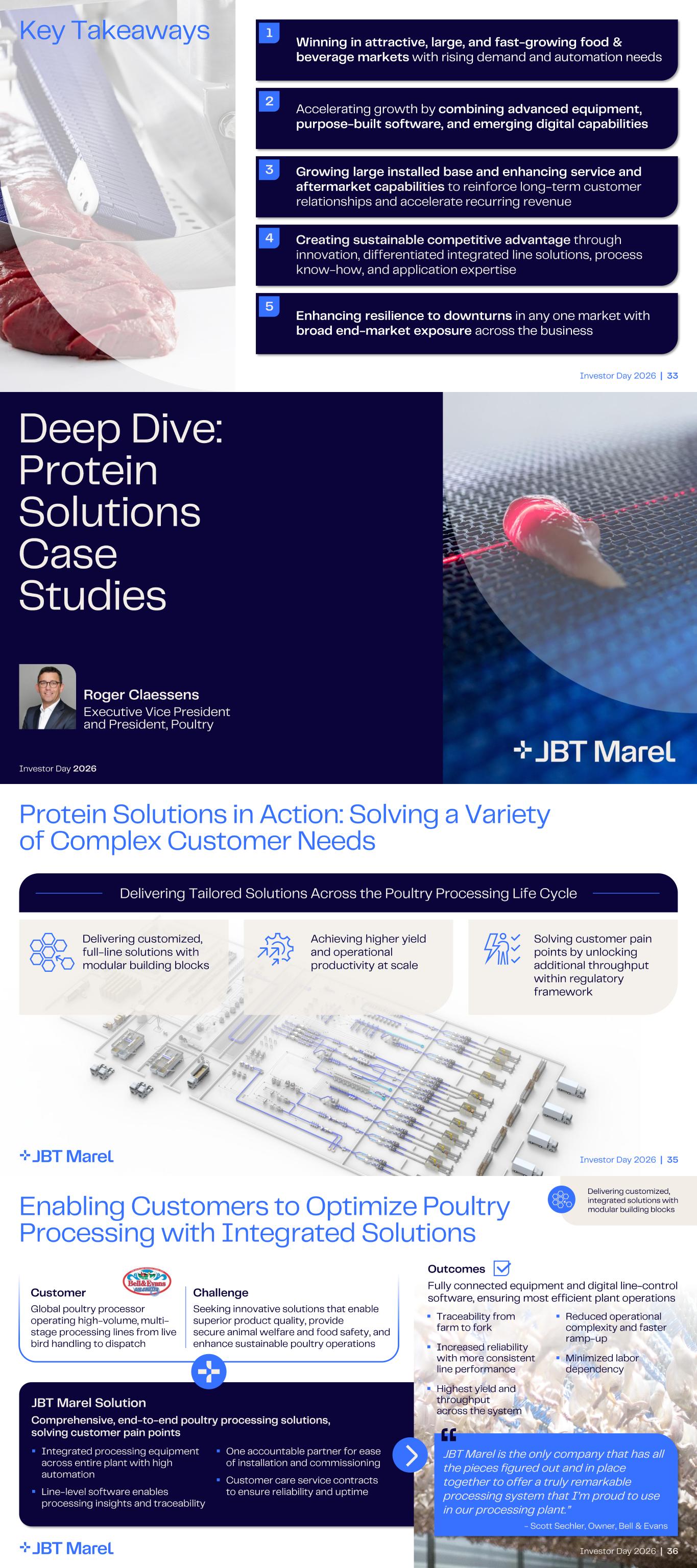 Investor Day 2026 | 33 Key Takeaways 2 1 Winning in attractive, large, and fast - growing food & beverage markets with rising demand and automation needs 3 Accelerating growth by combining advanced equipment, purpose - built software, and emerging digital capabilities 4 Growing large installed base and enhancing service and aftermarket capabilities to reinforce long - term customer relationships and accelerate recurring revenue 5 Enhancing resilience to downturns in any one market with broad end - market exposure across the business Creating sustainable competitive advantage through innovation, differentiated integrated line solutions, process know - how, and application expertise Roger Claessens Executive Vice President and President, Poultry Deep Dive: Protein Solutions Case Studies Investor Day 2026 Investor Day 2026 | 35 Delivering Tailored Solutions Across the Poultry Processing Life Cycle Protein Solutions in Action: Solving a Variety of Complex Customer Needs Delivering customized, full - line solutions with modular building blocks Achieving higher yield and operational productivity at scale Solving customer pain points by unlocking additional throughput within regulatory framework Investor Day 2026 | 36 Enabling Customers to Optimize Poultry Processing with Integrated Solutions Comprehensive, end - to - end poultry processing solutions, solving customer pain points Fully connected equipment and digital line - control software, ensuring most efficient plant operations Outcomes JBT Marel Solution Delivering customized, integrated solutions with modular building blocks Global poultry processor operating high - volume, multi - stage processing lines from live bird handling to dispatch Customer Challenge Seeking innovative solutions that enable superior product quality, provide secure animal welfare and food safety, and enhance sustainable poultry operations ▪ Integrated processing equipment across entire plant with high automation ▪ Line - level software enables processing insights and traceability ▪ One accountable partner for ease of installation and commissioning ▪ Customer care service contracts to ensure reliability and uptime ▪ Traceability from farm to fork ▪ Increased reliability with more consistent line performance ▪ Highest yield and throughput across the system ▪ Reduced operational complexity and faster ramp - up ▪ Minimized labor dependency “JBT Marel is the only company that has all the pieces figured out and in place together to offer a truly remarkable processing system that I’m proud to use in our processing plant.” - Scott Sechler, Owner, Bell & Evans