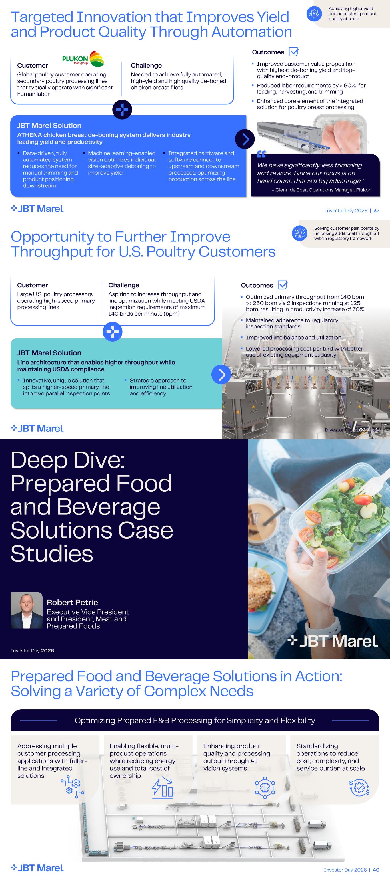 Investor Day 2026 | 37 Targeted Innovation that Improves Yield and Product Quality Through Automation ATHENA chicken breast de - boning system delivers industry leading yield and productivity JBT Marel Solution Global poultry customer operating secondary poultry processing lines that typically operate with significant human labor Customer Challenge Needed to achieve fully automated, high - yield and high quality de - boned chicken breast filets ▪ Data - driven, fully automated system reduces the need for manual trimming and product positioning downstream ▪ Integrated hardware and software connect to upstream and downstream processes, optimizing production across the line ▪ Machine learning - enabled vision optimizes individual, size - adaptive deboning to improve yield Outcomes ▪ Improved customer value proposition with highest de - boning yield and top - quality end - product ▪ Reduced labor requirements by > 60% for loading, harvesting, and trimming ▪ Enhanced core element of the integrated solution for poultry breast processing “We have significantly less trimming and rework. Since our focus is on head count, that is a big advantage." - Glenn de Boer, Operations Manager, Plukon Achieving higher yield and consistent product quality at scale Investor Day 2026 | 38 Opportunity to Further Improve Throughput for U.S. Poultry Customers Line architecture that enables higher throughput while maintaining USDA compliance JBT Marel Solution Large U.S. poultry processors operating high - speed primary processing lines Customer Challenge Aspiring to increase throughput and line optimization while meeting USDA inspection requirements of maximum 140 birds per minute (bpm) ▪ Innovative, unique solution that splits a higher - speed primary line into two parallel inspection points ▪ Strategic approach to improving line utilization and efficiency Outcomes ▪ Optimized primary throughput from 140 bpm to 250 bpm via 2 inspections running at 125 bpm, resulting in productivity increase of 70% ▪ Maintained adherence to regulatory inspection standards ▪ Improved line balance and utilization ▪ Lowered processing cost per bird with better use of existing equipment capacity Solving customer pain points by unlocking additional throughput within regulatory framework Robert Petrie Executive Vice President and President, Meat and Prepared Foods Deep Dive: Prepared Food and Beverage Solutions Case Studies Investor Day 2026 Investor Day 2026 | 40 Prepared Food and Beverage Solutions in Action: Solving a Variety of Complex Needs Addressing multiple customer processing applications with fuller - line and integrated solutions Enabling flexible, multi - product operations while reducing energy use and total cost of ownership Enhancing product quality and processing output through AI vision systems Standardizing operations to reduce cost, complexity, and service burden at scale Optimizing Prepared F&B Processing for Simplicity and Flexibility
